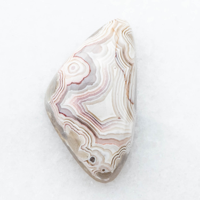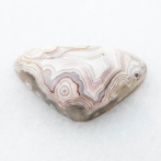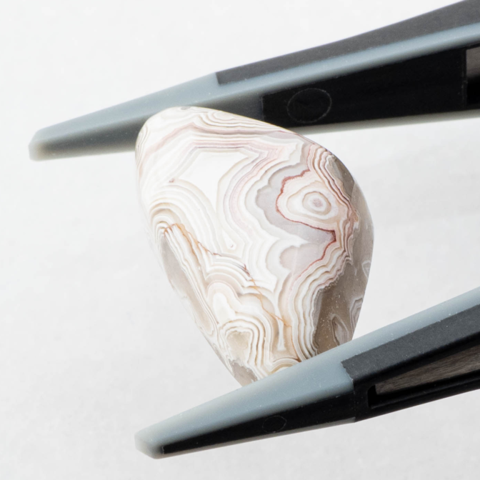 繊細な模様が幾重にもかさなり、レースのような模様を織りなすクレイジーレースアゲート。柔らかい桜色と白が織りなすハーモニーは、爽やかで可愛らしいのにとても大胆。ピンク系の色が入っているのに甘すぎないのは全体的に落ち着いたトーンの色でまとまっているから。計算され尽くした意匠に見えるのは石取りの巧みさもあり、大地と人間が協力して作り上げた芸術品なのです。