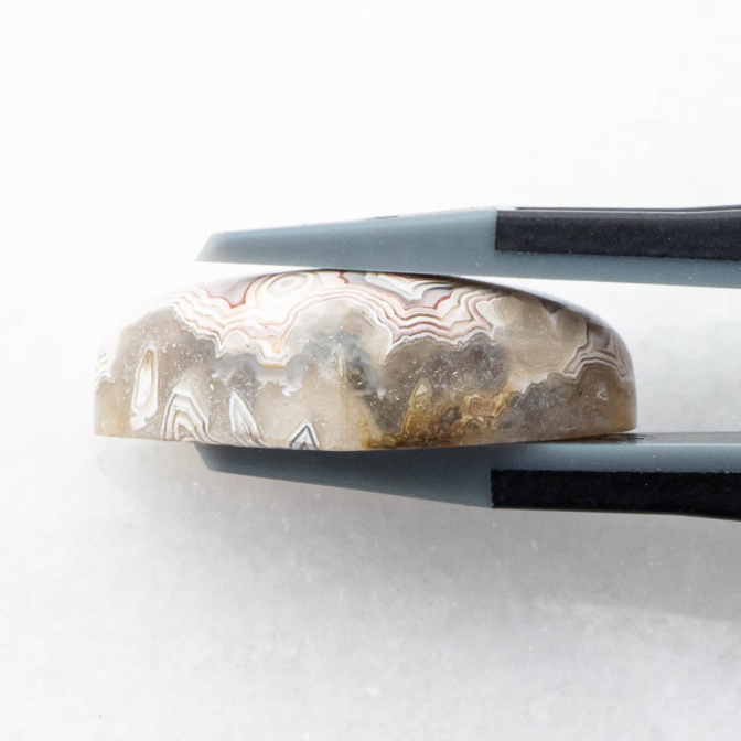 たくさんあるアゲートの仲間の中でも人気が高い石で、その模様の美しさは一度見たら忘れられないインパクトを持ちます。まさしく折り重なる地層を小さな大地のカケラにギュッと閉じ込めたようなスケール感あるルースです。クレイジーと名がつくほど気ままな曲線はまさに大地のいたずら。それでいてどこか温かみのある色合いなのは、大地が作り上げた芸術品だからでしょうか?