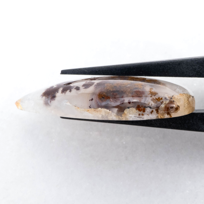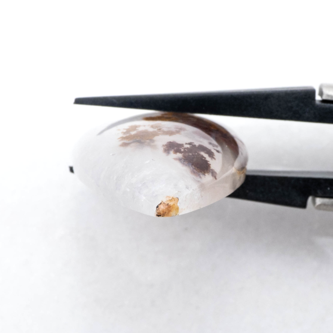 ガーデンクォーツのように清らかな佇まいを見せるランドスケープアゲート。澄んだ透明感をたたえたアゲートの中に、まるで植物のようなインクルージョンが入り込み、独特の景色を作り出しています。アゲートらしい乳白色で半透明の柔らかな輝きを持つ結晶が、この素敵なインクルージョンを包み込んでいるのが印象的。この質感の違いがルース全体をよりドラマティックに見せ、放射状に入っているシュワシュワとしたクラックが、氷のようにひんやりとしながらキラキラときらめく様を一層魅力的に見せています。