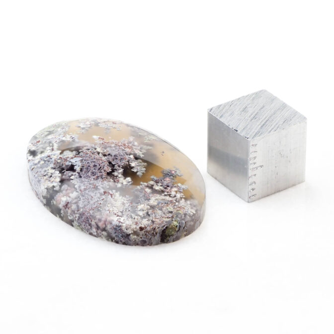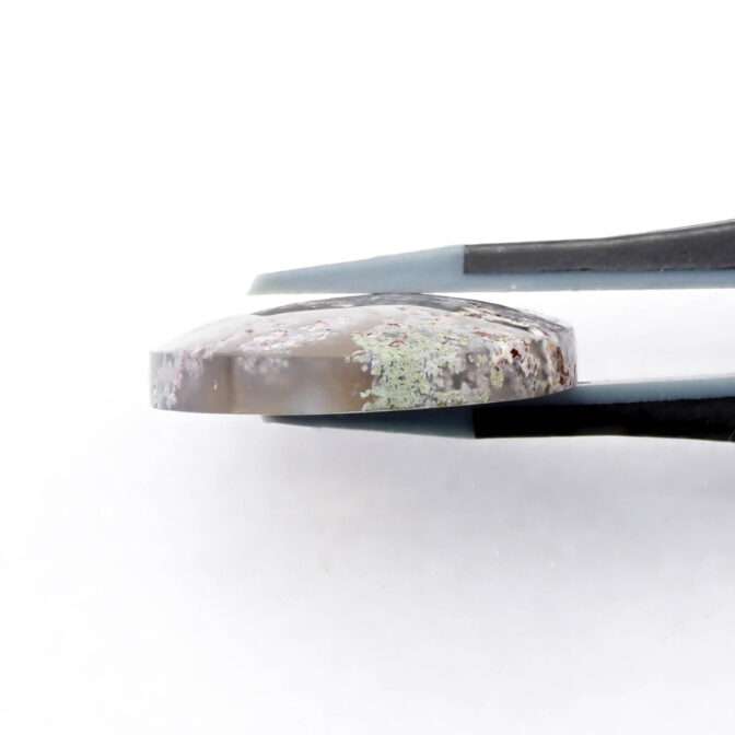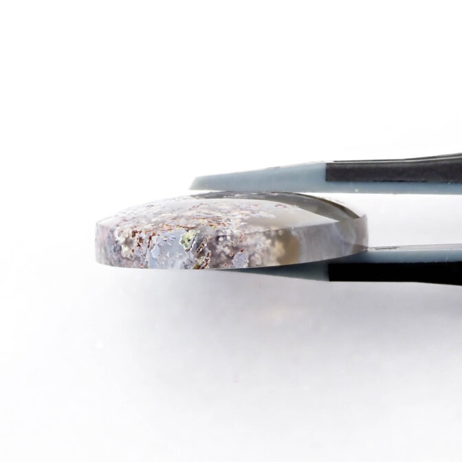 アゲートの中に異物が入りこむことで、美しい模様を織りなすランドスケープアゲート。アゲートはとても硬く、インクルージョンと硬度差があるので、研磨が難しい石でもあります。同じ力で磨くとでこぼこになってしまいますし、正体不明のインクルージョンをつやりと磨ける研磨剤の選定にも頭を悩ませてしまいます。よって、この手の石は研磨が行き届いていないことも多いのですが、このルースは見事に ツヤツヤに磨き上げられています。石の美しさを極限まで引き出す技術と気概のある研磨士の方の手仕事にはいつも頭が下がりますね。