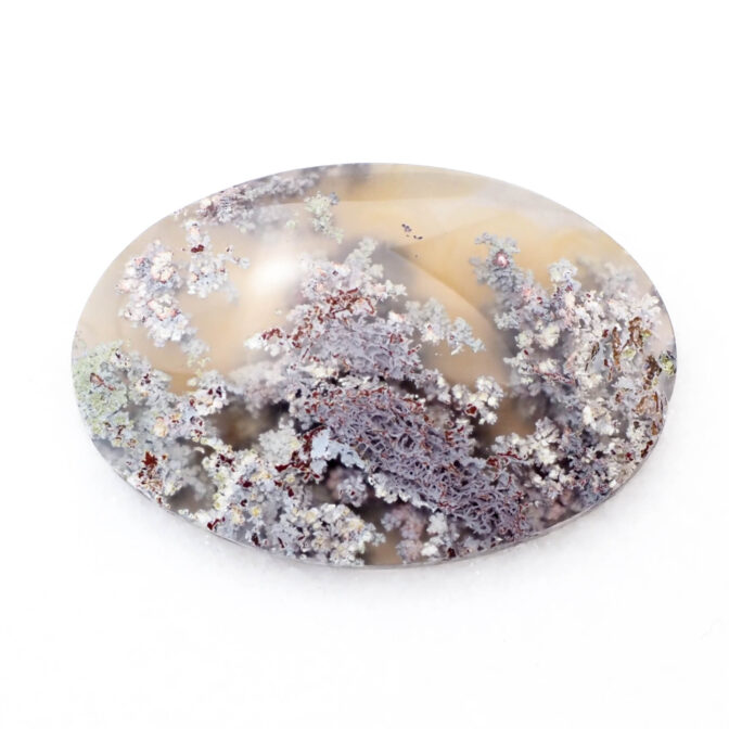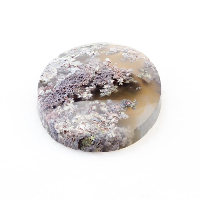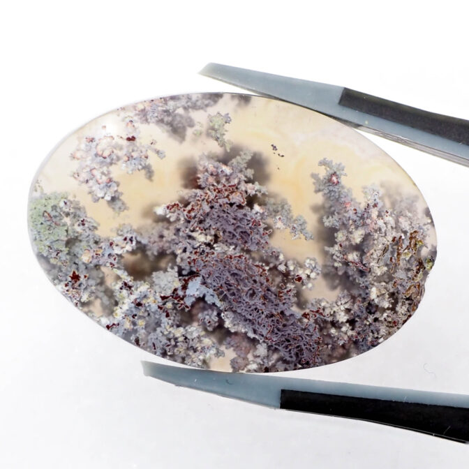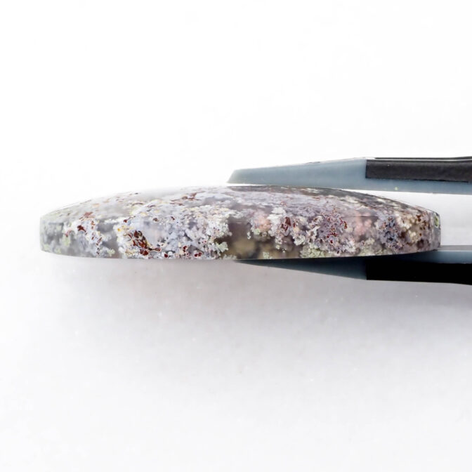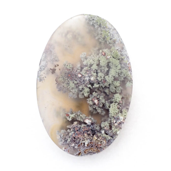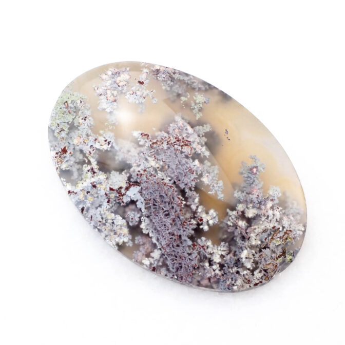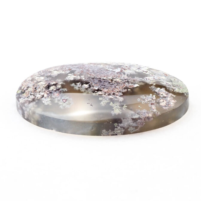 ため息が出るほど美しく華やか。透け感たっぷりのニュアンスカラーのアゲートに、パステルカラーのインクルージョンが映える、完成度が高いデザインのルースです。透明度の高い部分とマットな模様のコントラストがはっきりとしており、一度見たら忘れられないほど美しいランドスケープアゲートです。