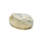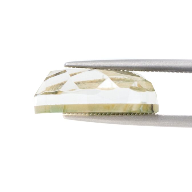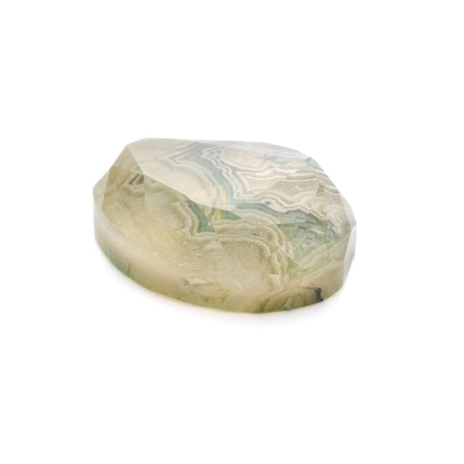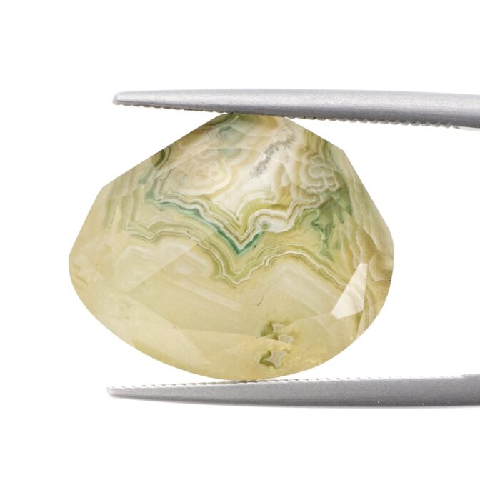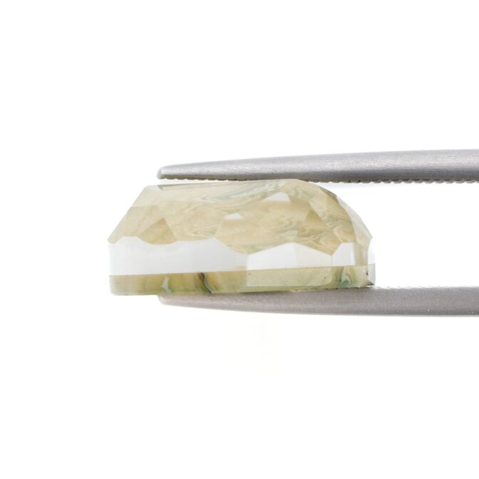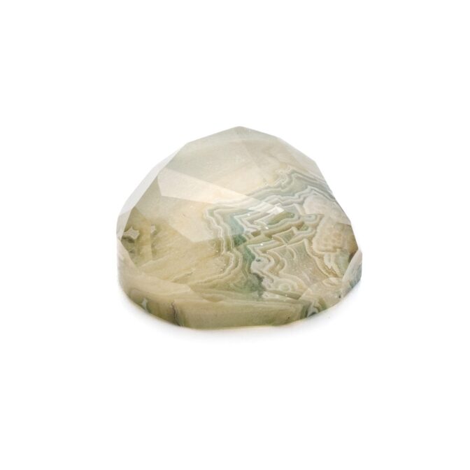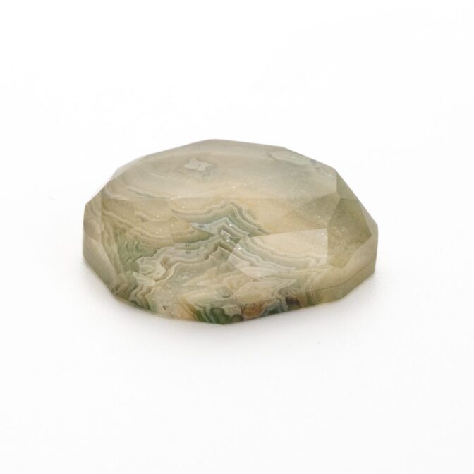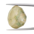 ブラウンがかった渋い抹茶色。柔らかくフリーダムに整えられたシェイプがとても心地よく感じられます。不規則な形に合わせてランダムにカットされたファセットもとても意外性のある美しさ。感性の求めるまま、自由に美しく輝く個性的なルースです。
