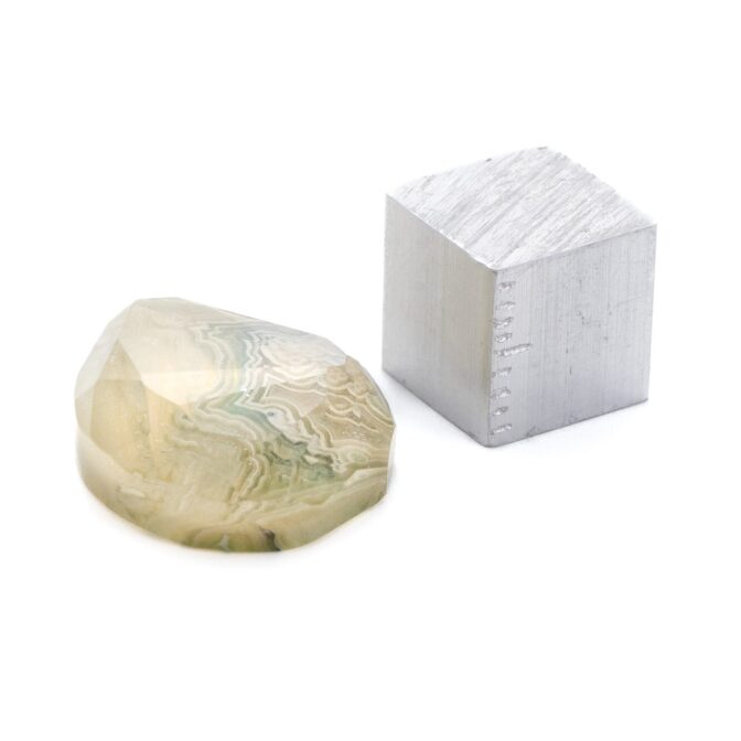 ダブレット制作は絵画や風景、幾何学模様を連想させる石のセレクトから始まります。山ほどある原石からどのように模様を削り出すか。石取りと呼ばれる工程で様々に検討し、ここだ!という部分を薄い板状にカットします。その後、透明度の高いクォーツやルチルクォーツと接着し、カットと磨きを施します。クォーツの磨きが悪いと美しい模様が引き立たないので、磨きはダブレットストーンの完成度を左右する大事な工程と言えます。経験豊かな職人さんの丁寧かつ高いカット技術があるからこそ、クォリティの高いダブレットを生み出すことができるのです。