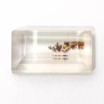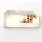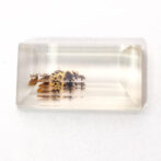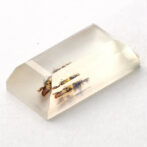ダブレット制作は絵画や風景、幾何学模様を連想させる美しい石をセレクトするところから始まります。山ほどある原石のどの部分からどのように模様を削り出すか、石取りと呼ばれる工程で様々に検討され、ここだ!という部分を透けるほど薄くカットします。その後、透明度の高いクォーツと特殊な接着剤で接合し、クォーツ部分にカットと磨きを施します。このクォーツの磨きが悪いとベースとなる石の美しい模様が引き立たないため、ダブレットストーンの完成度を左右する大事な工程と言えます。ここでも職人さんの丁寧かつ高いカット技術が光ります。