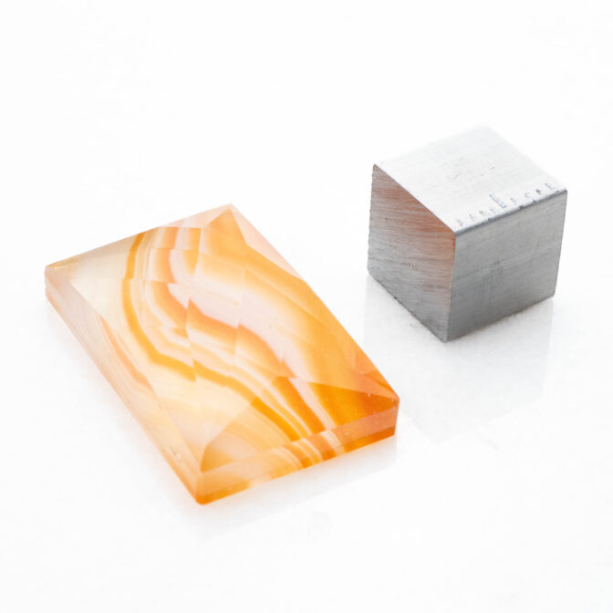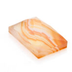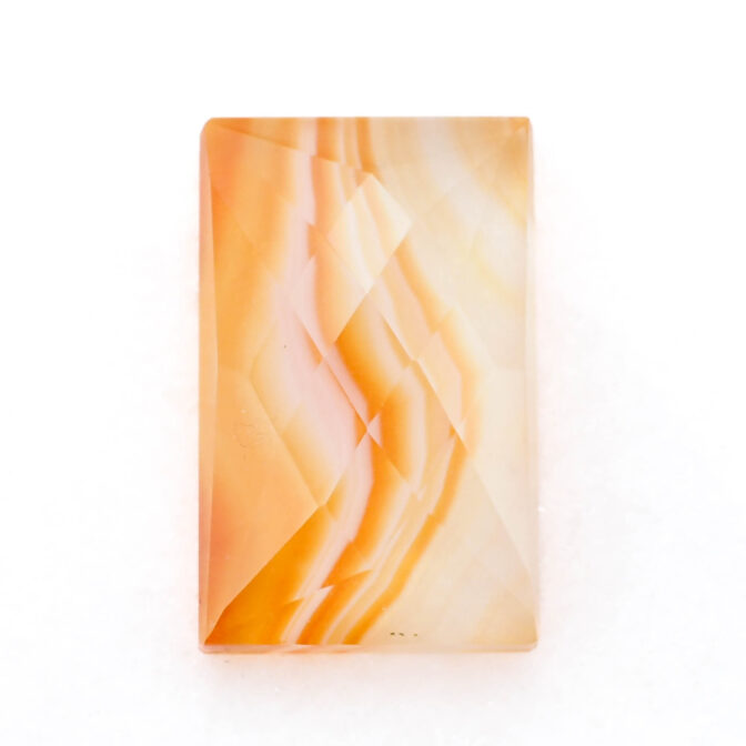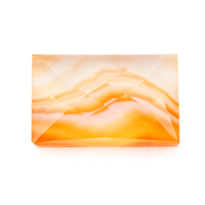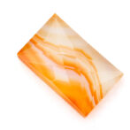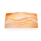 夕焼け空の鮮やかなオレンジをほうふつとさせる色合い。柔らかな曲線を描きながらグラデーションになっている模様は、さながら沈む太陽を映した波打ち際のよう。強い色のはずなのに、半透明の優しい質感でふんわりと内側から発光していルように見えます。珍しい石ではないのですが、それ故に美しく磨かれた石を探すのが難しく、クォリティの高いルースはとても希少です。