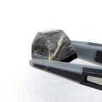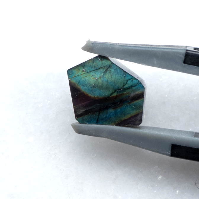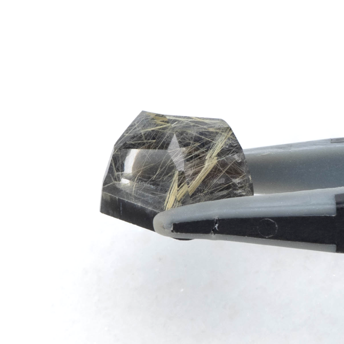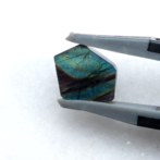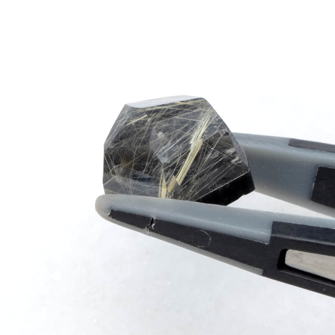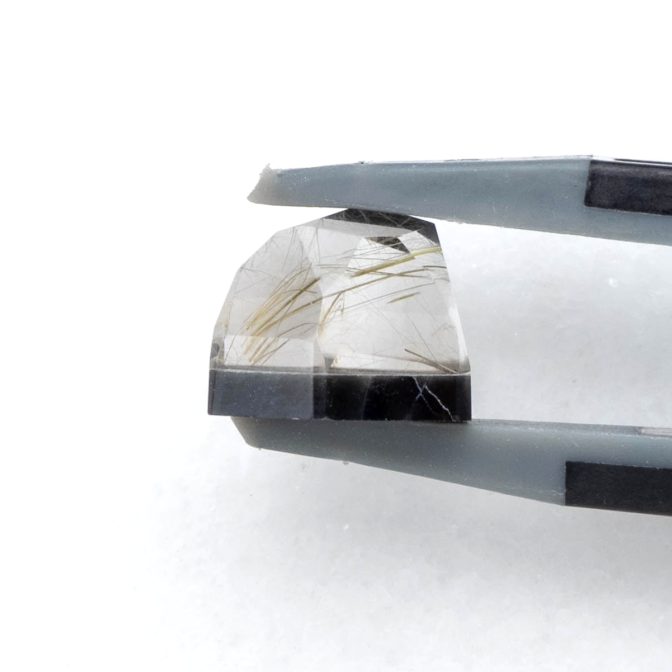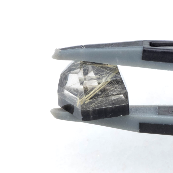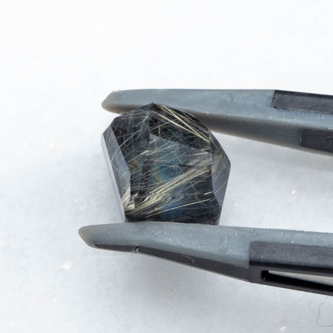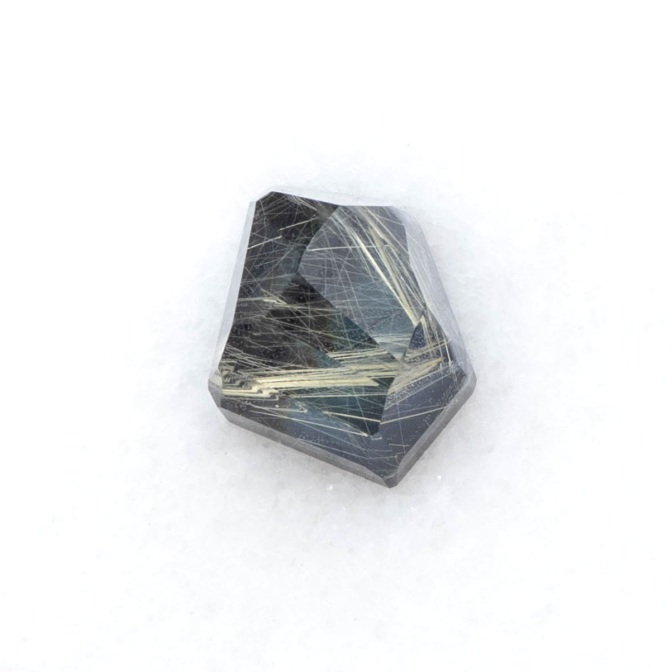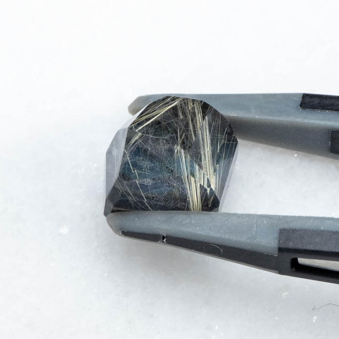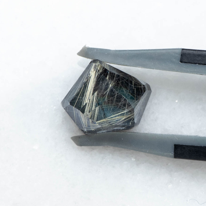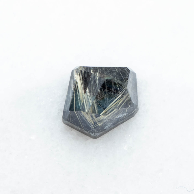 このページでご紹介しているルチルクォーツxスペクトロライトは、小粒でも青いラブラドレッセンスがしっかり輝く存在感があるルースです。ほぼ全面にブルーグリーンの光が閃くように走り、落ち着いた中にも華やかさを演出します。山高で透明度の高いクォーツが迫力の美しさで、横から見た姿も神々しいまでのオーラを放ちます。