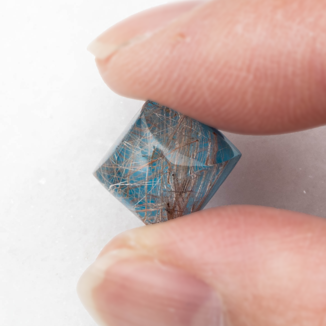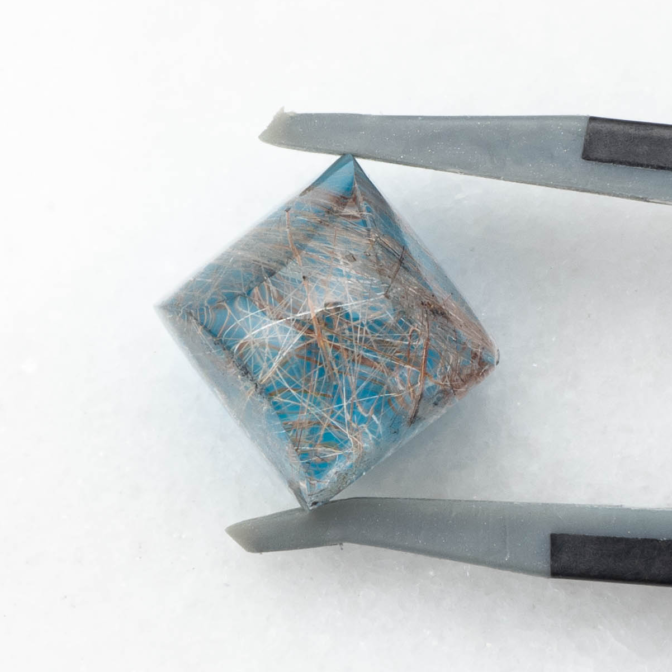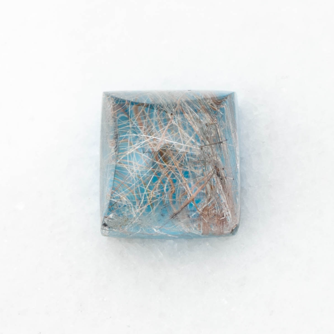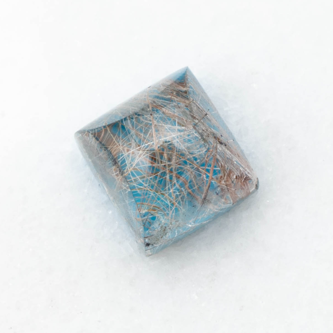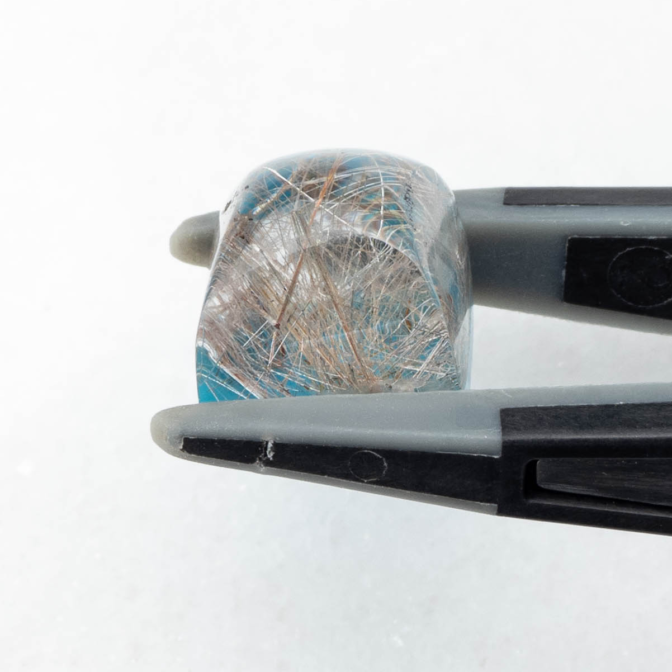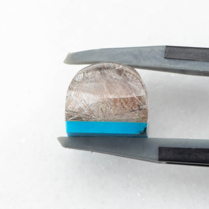 このページでご紹介しているターコイズxルチルクォーツのダブレットは、小粒ですがゴージャスな存在感があり、品よくきらめく美しい石です。ふっくらと厚みのあるルチルクォーツがみずみずしく輝き、ターコイズのブルーとルチルクォーツのきらめきをより美しく引き立たせます。小さなルースの中に繊細なルチルがぎっしりと入っており、奥行き感と深みがダブレットならでは。小粒でも存在感のあるルースですので、大粒ジュエリーが苦手な方にもおすすめです。