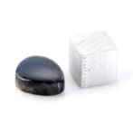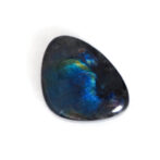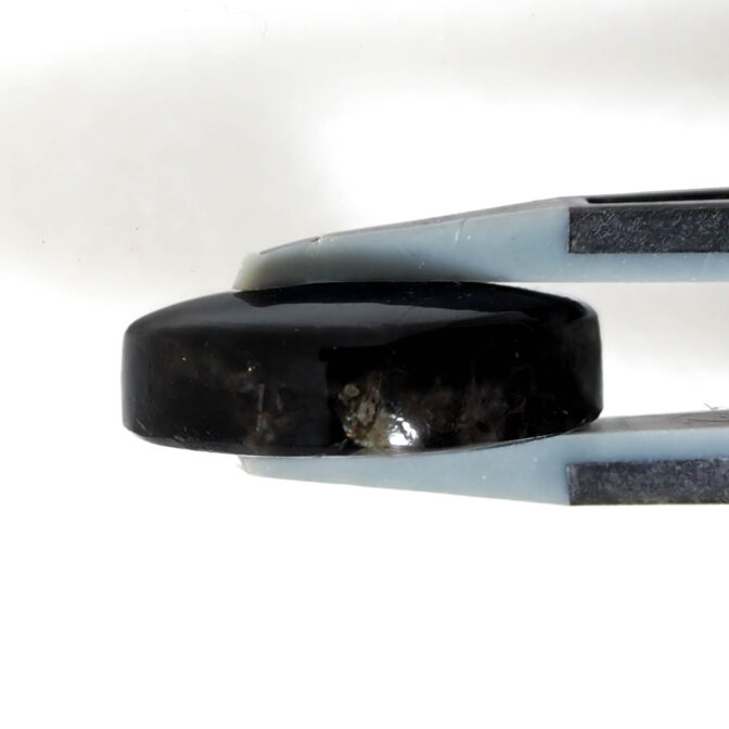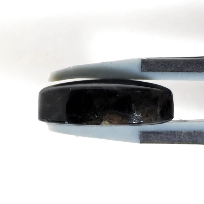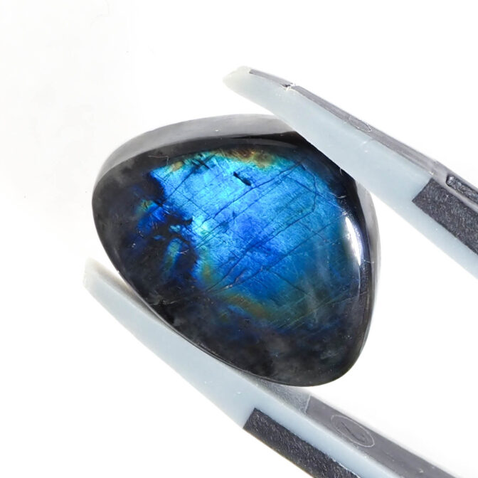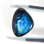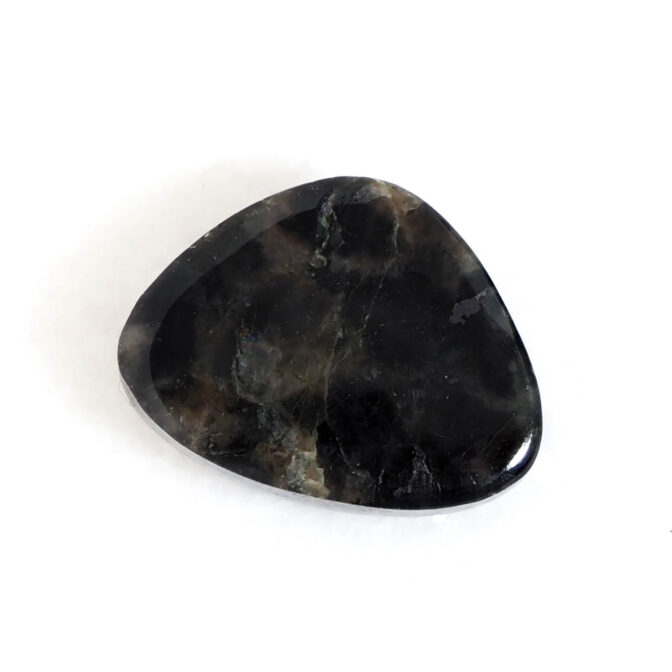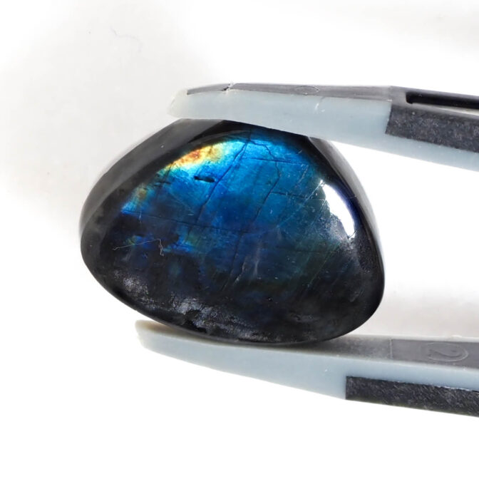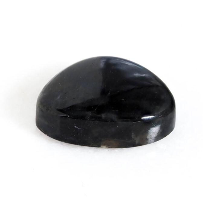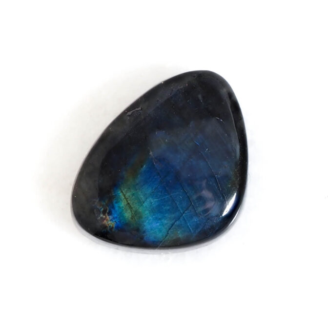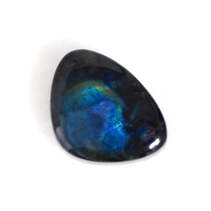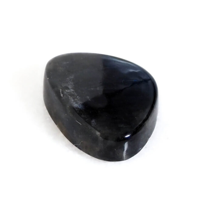 潤んだような艶を放つブラックの地色に、光の悪戯で一瞬強く輝くブルーとイエローの光は、ラブラドライトとはまた違った魅力を持っています。宇宙を思わせる色と質感、輝きがとても人気なのですが、流通量が少なく大きなサイズのルースで見かけることはほとんどありません。こちらのルースは丸みを帯び、柔らかな曲線が可愛らしい形です。迫力ある佇まいが魅力の石ですが、強いだけではなくどこか柔らかさも感じます。