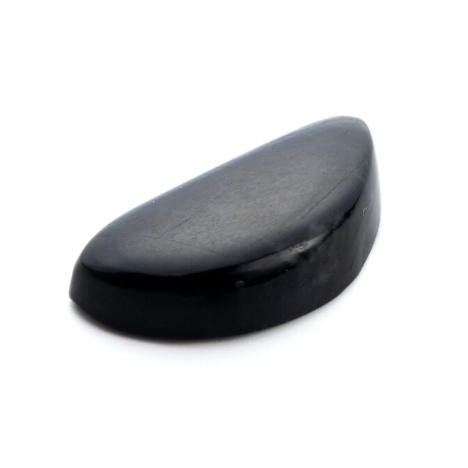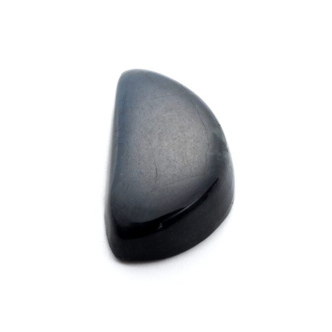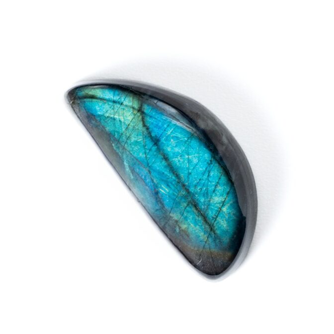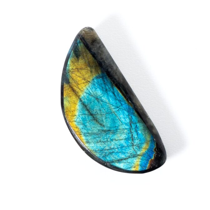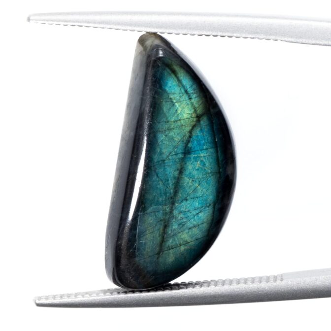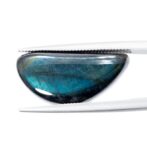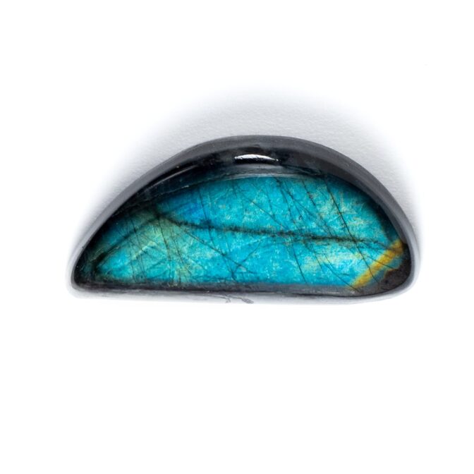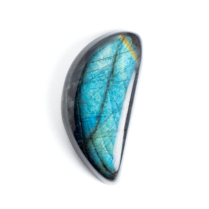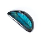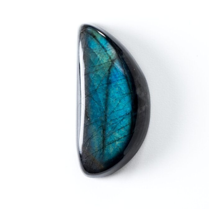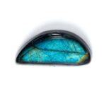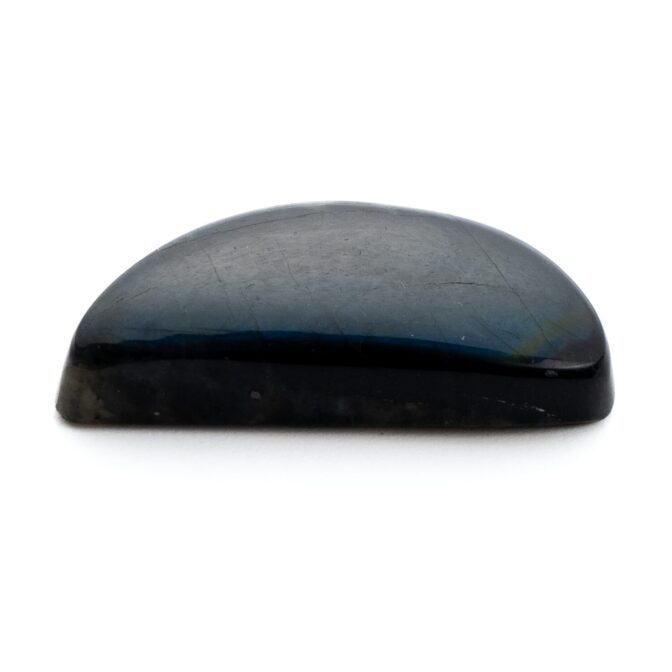 純粋さを感じさせるブラックが潤んだような艶を放ち、光の悪戯で一瞬強く輝くスペクトロ光は、ラブラドライトとは一線を画す魅力を持っています。透明さを感じるブルーが、漆黒の石の表面を滑らかに照らすミステリアスな輝きも、私たちを虜にしてしまう美しさ。この石ならではの色と質感、輝きがとても人気なのですが、流通量が少なく大きなサイズのルースで見かけることはほとんどありません。こちらのルースは丸みを帯び、柔らかな曲線で描かれた半月の形にカットされ、スペクトロライトの神秘的な輝きをより魅力的に見せてくれます。