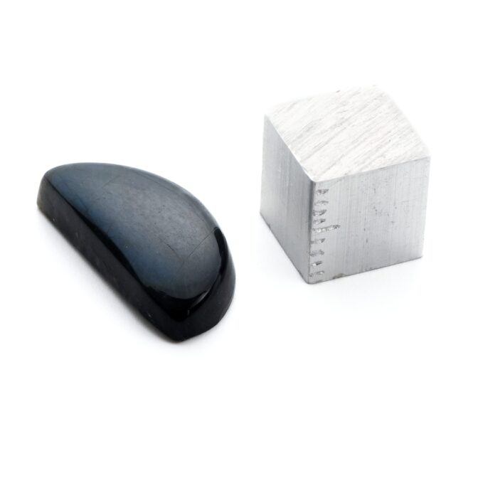 無限の宇宙を感じさせる艶めく漆黒の石の表面に、あざやかなブルーの光がひらめくように輝くスペクトロライト。なんの変哲もない黒い石の合間からのぞくまばゆい光はまさに稲妻のよう。光が石の表面を駆け巡る圧倒的な美しさを持つドラマティックなルースです。