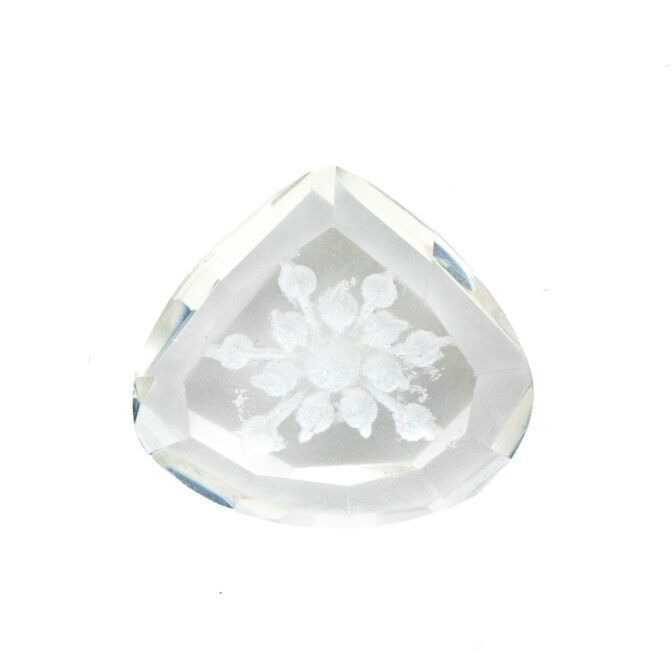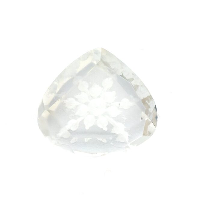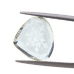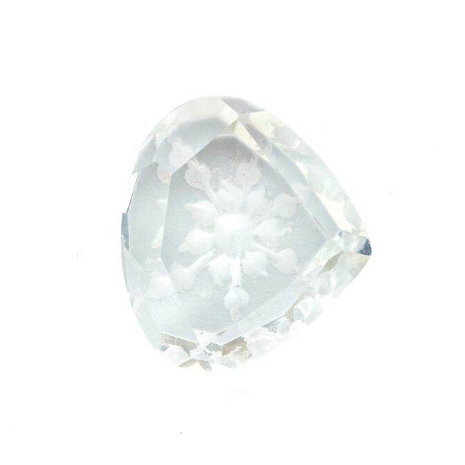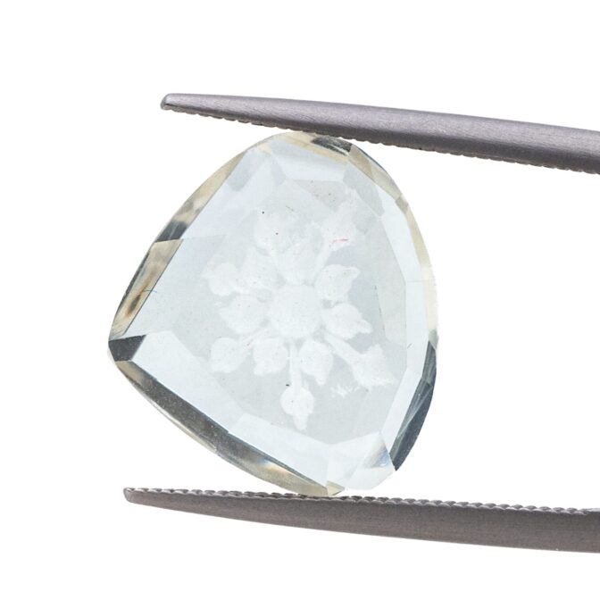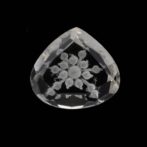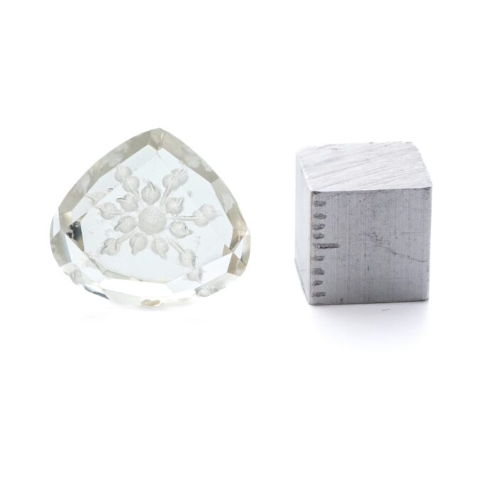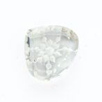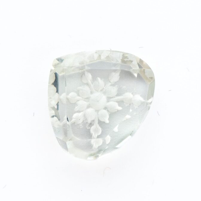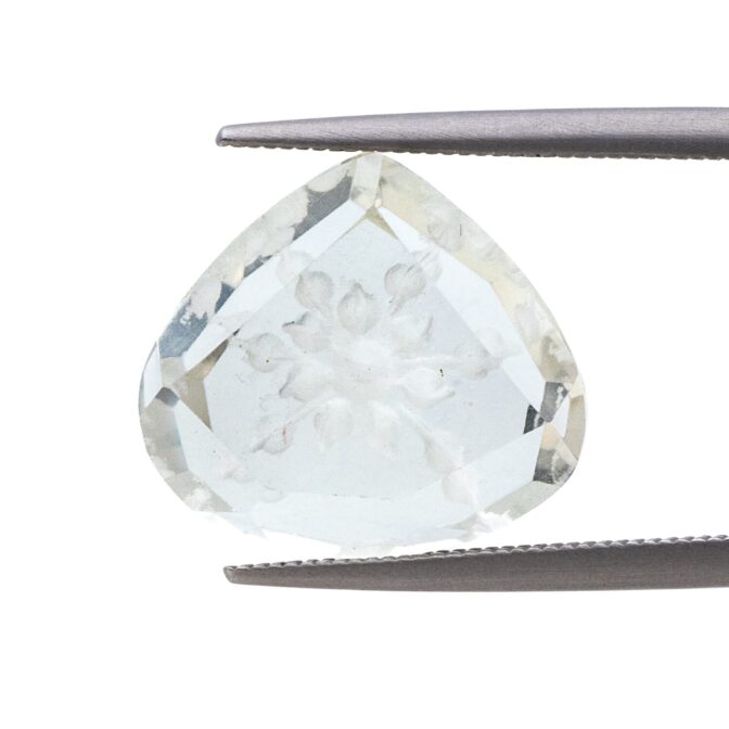 このページでご紹介しているグリーンアメジストのインタリオは、本来無機物である鉱物に、まるで生命を持つかのような大輪の花が、柔らかく咲き誇るように彫り込まれています。花びらの一枚一枚が、ため息が出るほど美しい繊細さ。やや色が薄めですが、ほんのりグリーンにきらめく雫シェイプが洗練を感じさせます。目立つインクルージョンがないクリアな原石を使用しているのも、インタリオをより輝かせています。