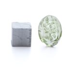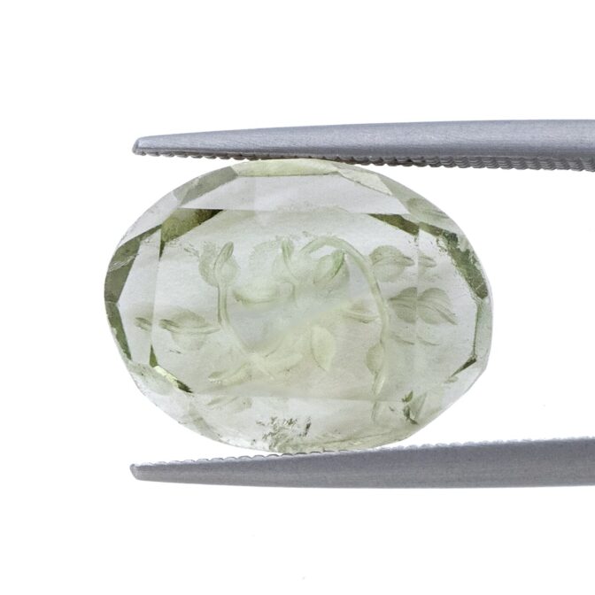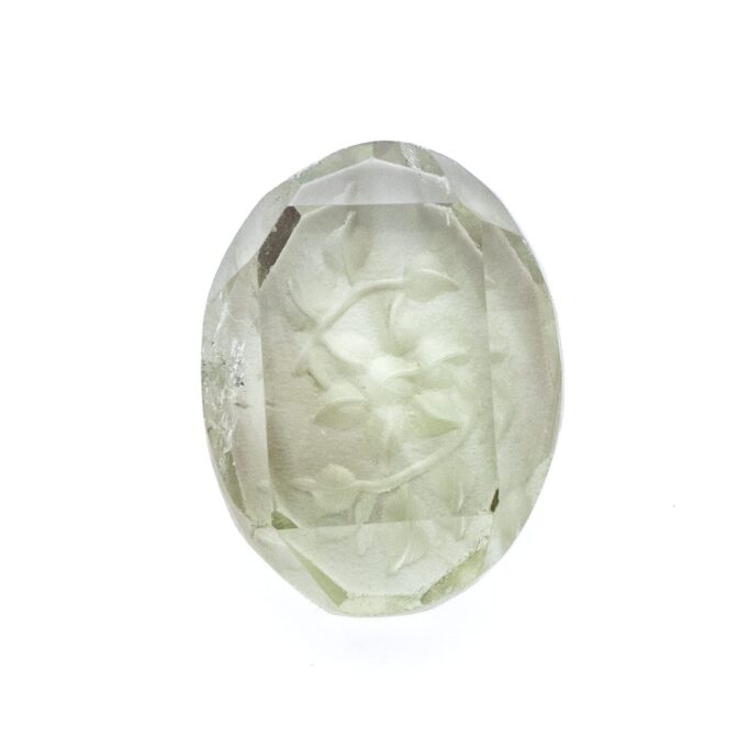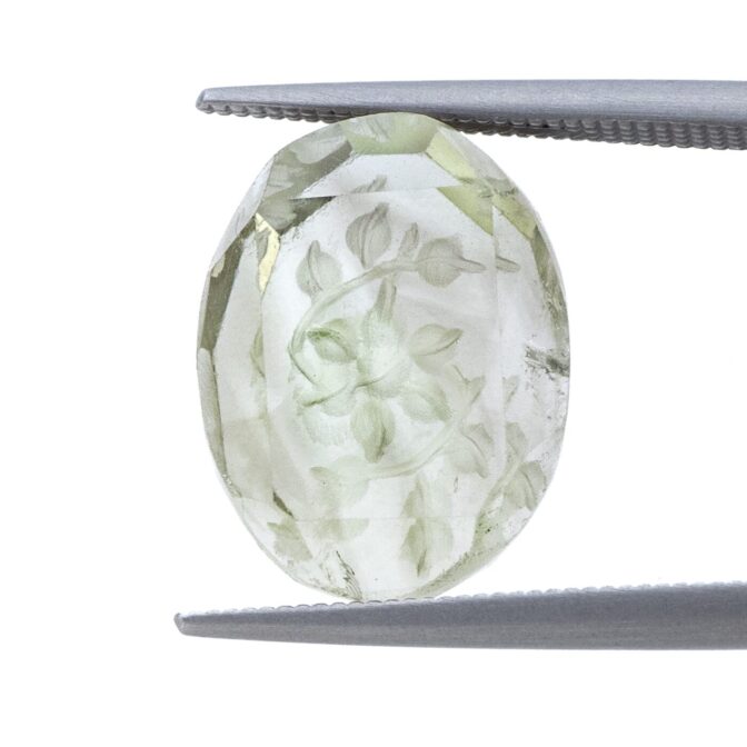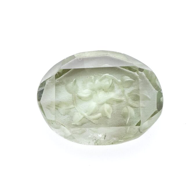 このページでご紹介しているグリーンアメジストのインタリオは、本来無機物である鉱物に、まるで生命を持つかのような植物が、柔らかく咲き誇るように彫り込まれています。葉の一枚一枚が、ため息が出るほど美しい繊細さ。額縁のようなオーバルシェイプに、シンプルに輝くシングルカットの洗練された佇まいがとてもおしゃれです。目立つインクルージョンがないクリアな原石を使用しているのも、インタリオをより輝かせています。