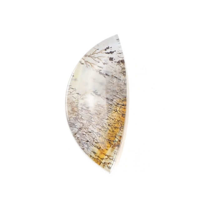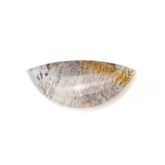 ふっくらとした半月の、お月様のような形がかわいいデンドリティッククォーツ。うっすら真珠のような輝きをまとった乳白色のクォーツが、優しい表情を宿しています。繊細に絡み合うデンドリティックインクルージョンが織りなすパターンも個性豊かにクォーツを飾っています。オレンジ色のカラーバンドがグラフィカルでおしゃれ。大草原の一部を切り取った様な景色にも見えるのが魅力的ですね。