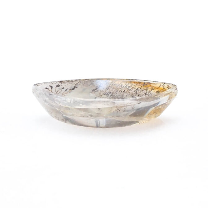 デンドリティッククォーツのようにインクルージョンが多い石は、傷やクラックを感じさせる磨き上がりになるのですが、このページでご紹介しているデンドリティッククォーツは、まっさらでつやつやの質感が美しいルースに仕上げられています。全体的に可愛らしい雰囲気ながらも上質感を漂わせているのは、丁寧なカットと研磨を施されているから。大人が身につけるにふさわしい品格があるルースに仕立てられています。