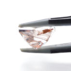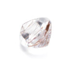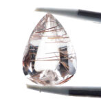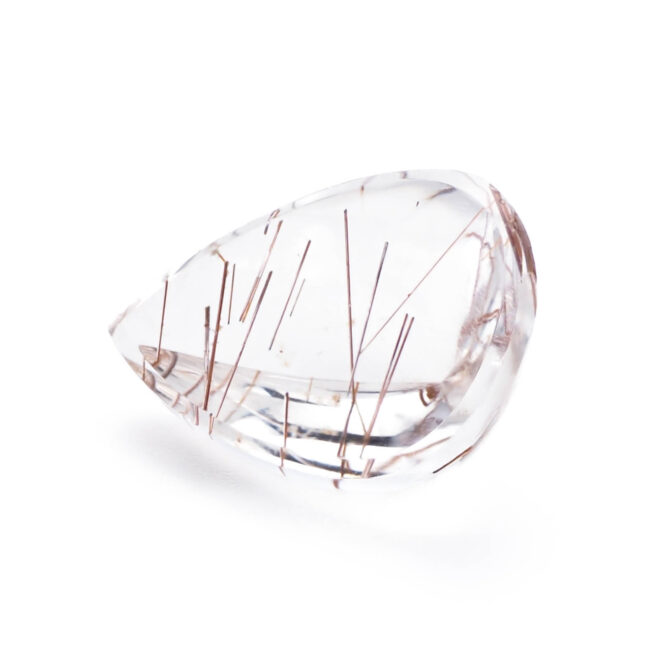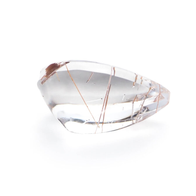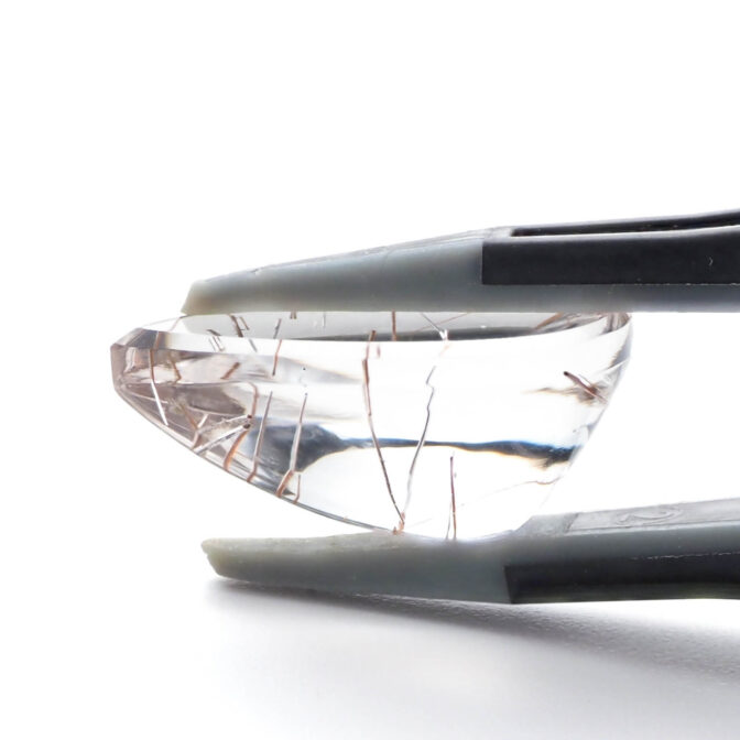 そんな厳しい基準でセレクトしてきたこちらのルチルクォーツは、カットのユニークさが目を惹きます。テーブル面(おもて面)はフラットでシャープな印象。これは、ピンク色に輝くルチルを強調するために工夫されたカットです。裏面はなだらかなカーブを描き、ぷるんとした質感をより強調するようになっています。質が良く、透明度の高い原石からしか削り出せない上質なルースです。