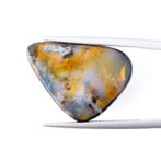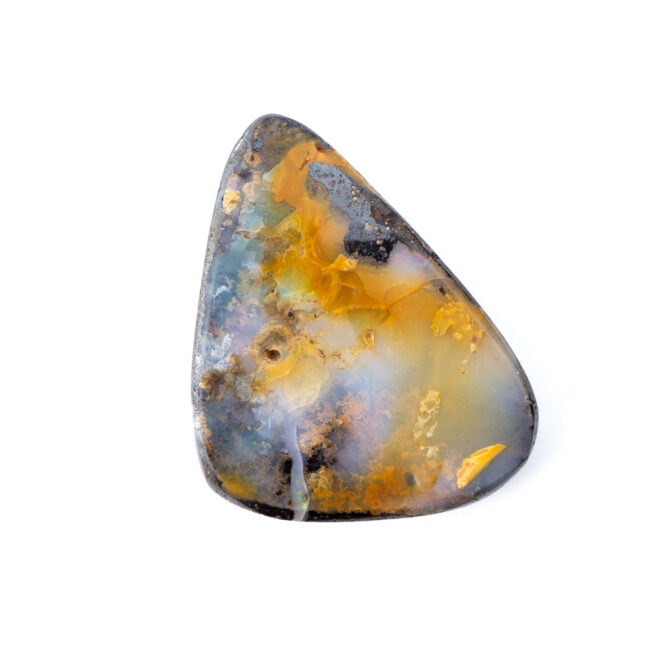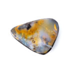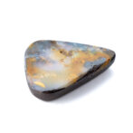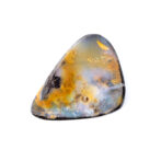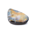 そもそもボルダーオパールとは、母岩と一緒に産出する層状や薄片状のオパールのこと。こちらのボルダーオパールが持つ、うっすら乳白色で半透明のオパール層から透けて見える母岩の質感や、オレンジ色の帯状カラーの入り方はとても個性的でおしゃれに見えます。ボルダーオパールの生成過程で生じる偶然の美は、むしろこの石ならではと言えるかもしれません。さまざまな母岩の色や模様がオパールを彩り、虹色の光がなくても個性が輝く美しいルースに仕上がるのです。一つとして同じものがなく、多彩な魅力を持つボルダーオパールのもう一つの魅力だと思います。