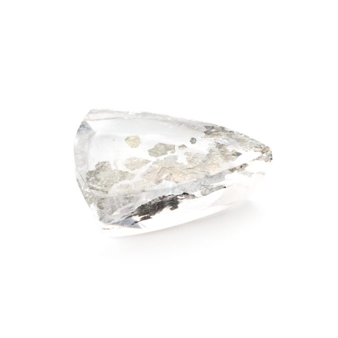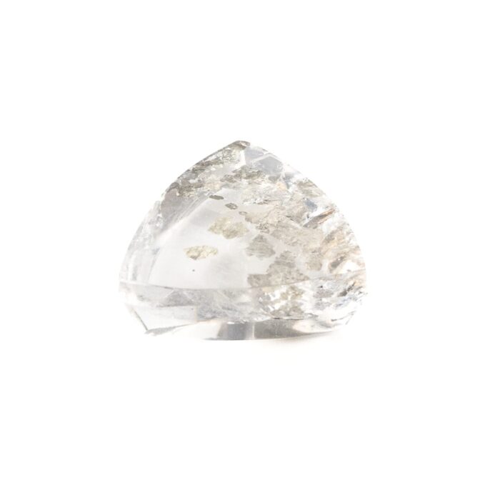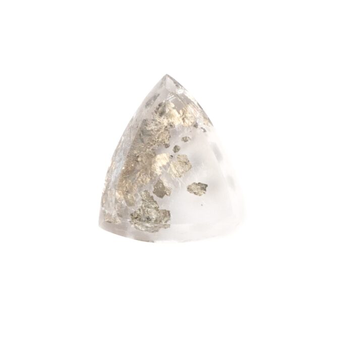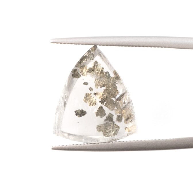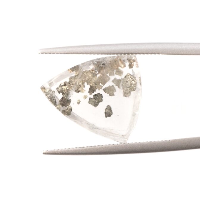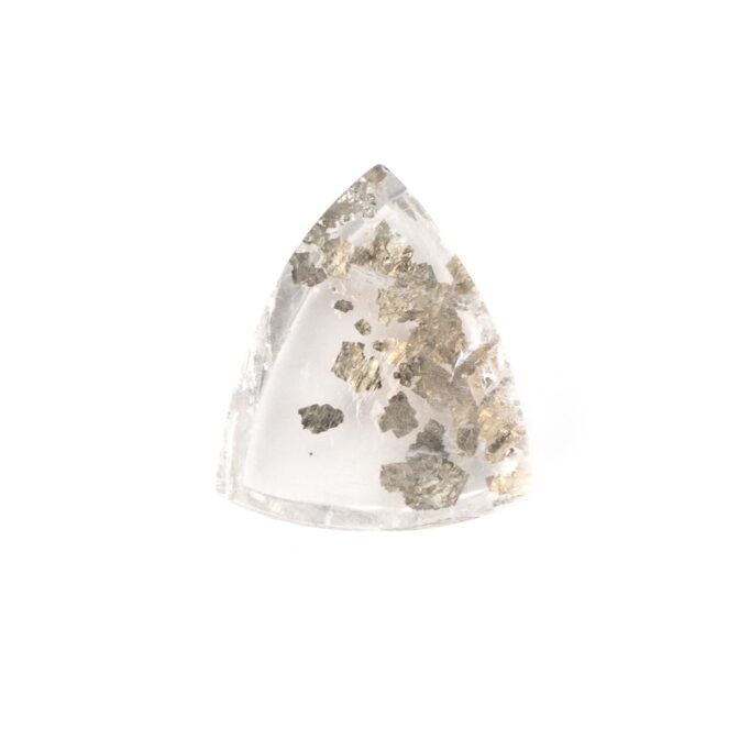 【透明なクォーツにキラキラと輝くパイライトが迫力のある美しさのルース】