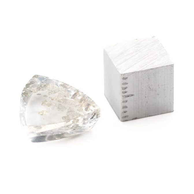 パイライトの単体結晶は珍しくないのですが、透明度の高いクォーツに入っているのはとても希少です。ちなみに、このパイライトのように結晶が平たい場合、鉱物名のマーカサイトという名で呼ばれることもあります。