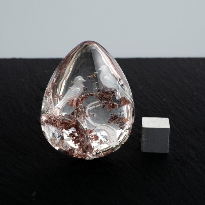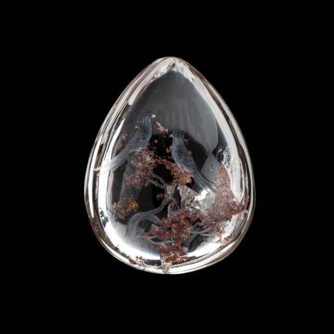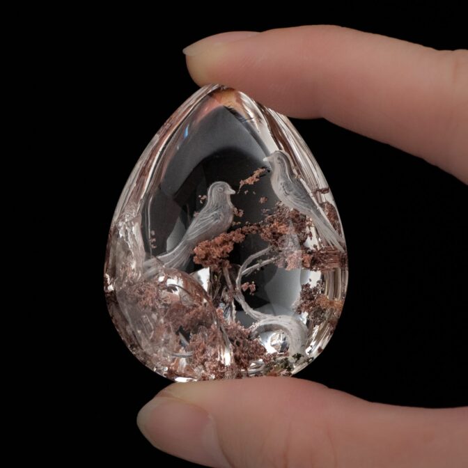 と思っていたのに、今回の香港買い付けで出会ってしまったのが、こちらのインタリオ入りガーデンクォーツ。そんなバカな、と思って二度見ならぬ三度見をしてしまいました。まるで透明な湖の水をそのまま石にしてしまったかのような純粋な輝きの中に、明るくカラフルなインクルージョン。そして、クォーツが作り出す庭で戯れる、躍動感あふれる2羽の鳥たち。鮮やかな彫りのインタリオで表現された、神秘的な世界。鳥好きはもちろん、そうでなくても惹きつけられる、今どき珍しいほど凝った作りのルースで、素晴らしい芸術品です。数千年の間、石を「玉」と呼び、大切に扱ってきた国だからこそできることだと思います。