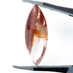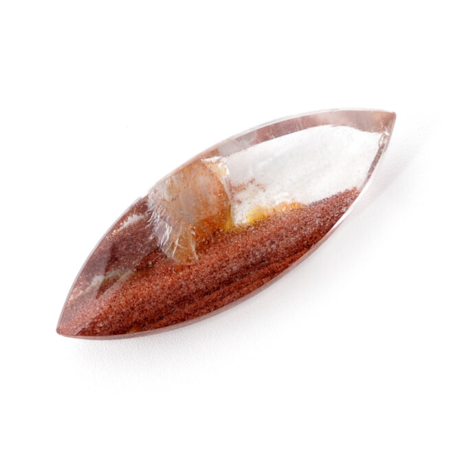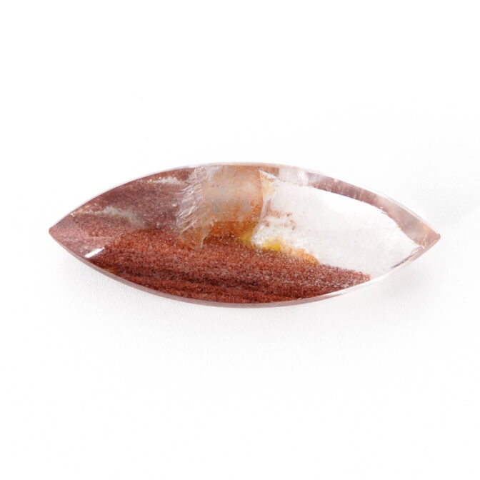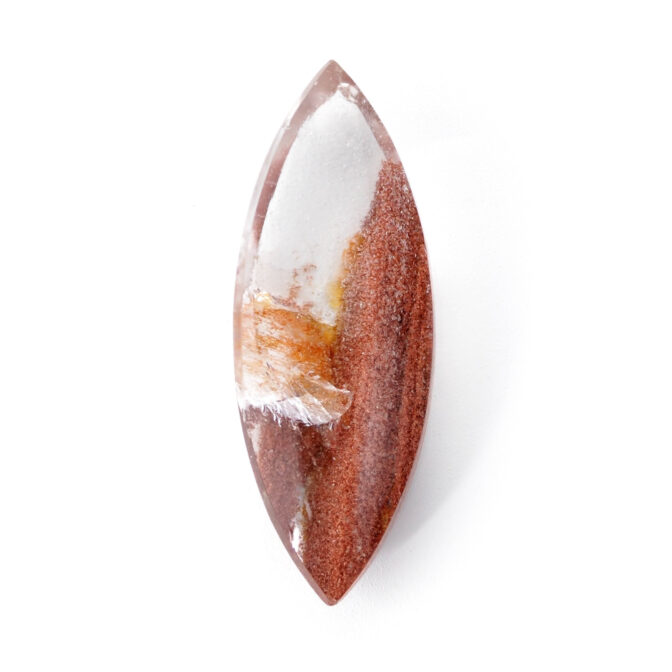 そんな思い入れ深いガーデンクォーツ、今回セレクトしたのは洗練された印象のマーキスカボションカットのルースです。赤茶色の砂のようなインクルージョンに、微かに銀色に輝く小さな粒がまとわりつき、チカチカと瞬きます。荒涼とした砂漠の光景を宿し、中央のクラックが太陽のようにきらめきます。