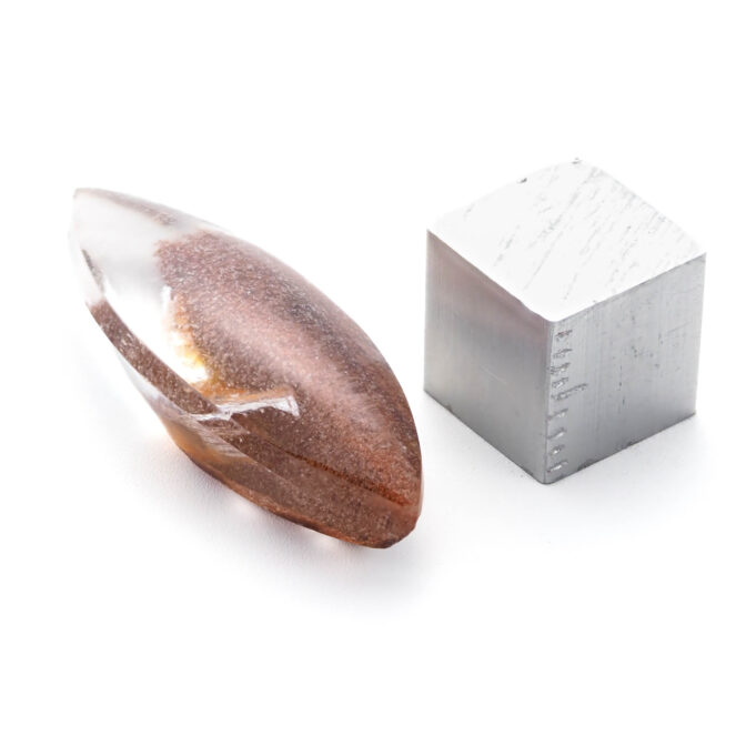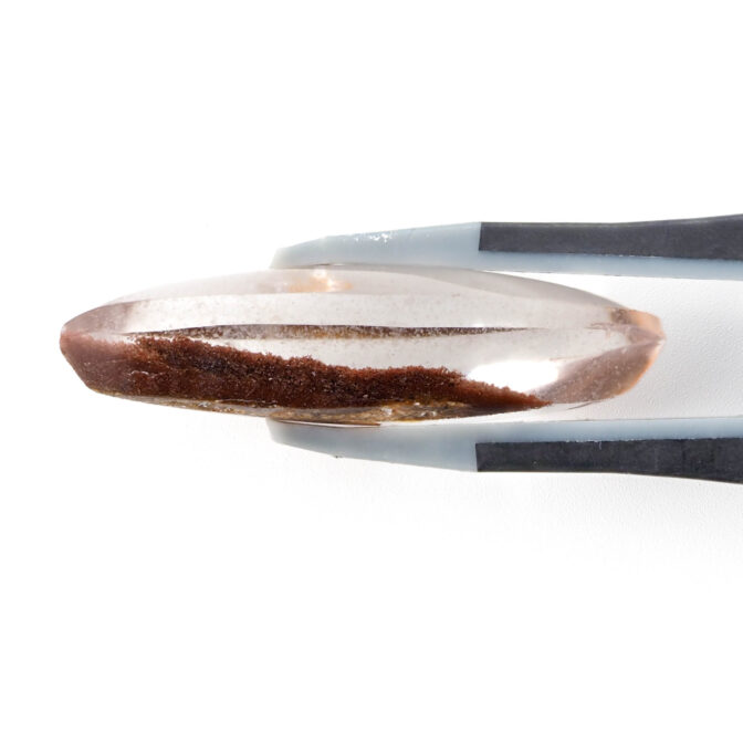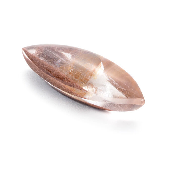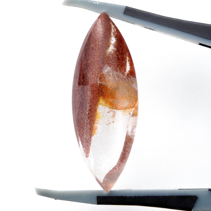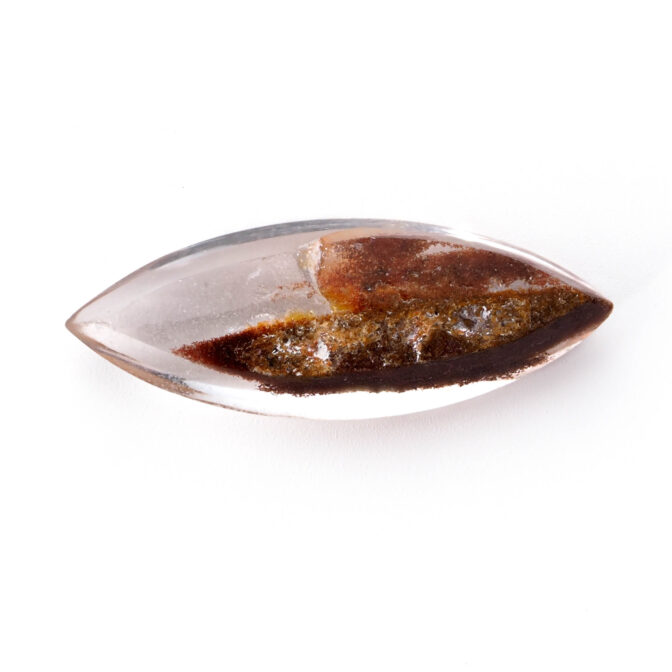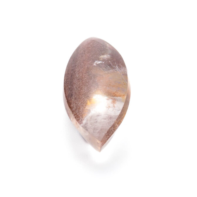 通常、大きめのオーバルカボションにカットされることが多いガーデンクォーツ。素朴な雰囲気を持ち、ジュエリーに加工するとなると、ピンとくるものになかなか出会えないことがあります。その点、大変バランスの美しいマーキスカットで、ジュエリーにしても映えそうです。また、艶やかな透明度を誇るガーデンクォーツですので、あえて観賞用にするのも正解かもしれません。