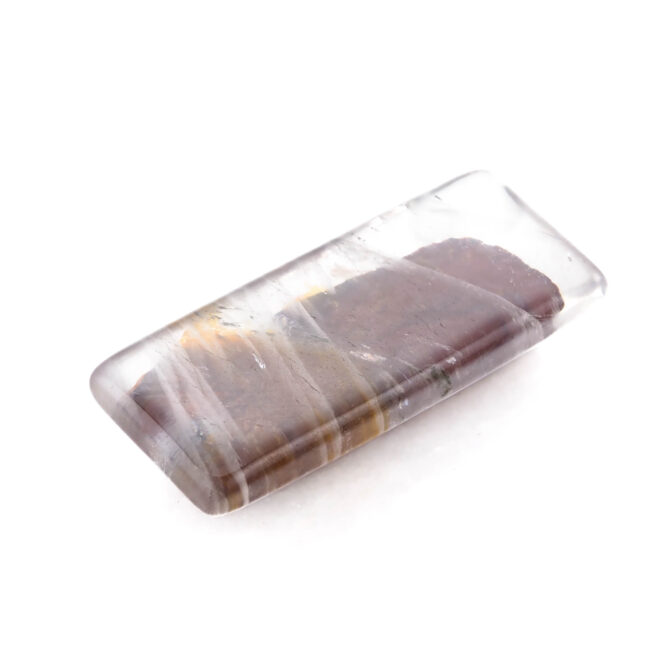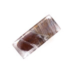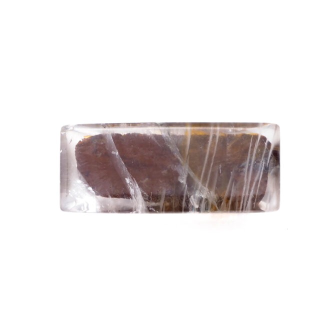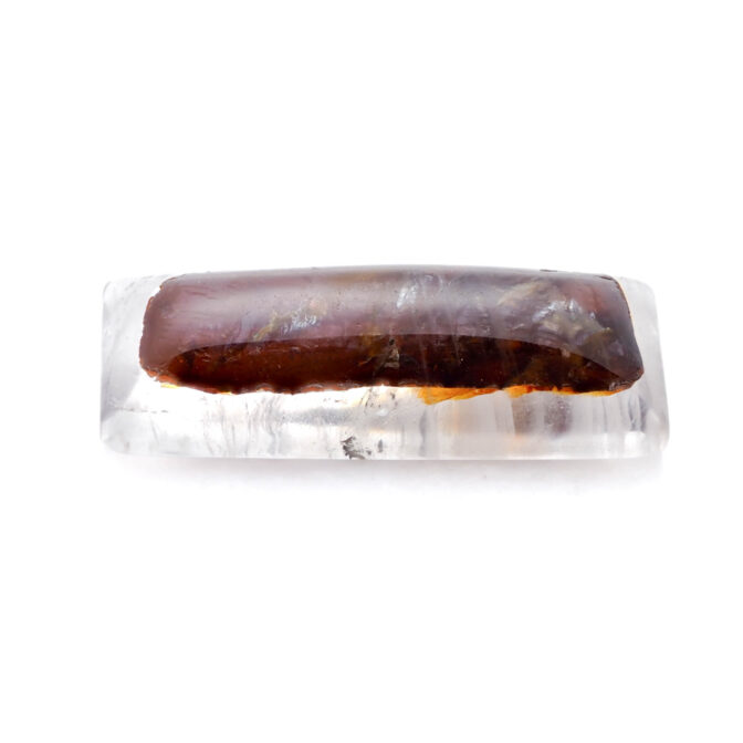 そんな思い入れ深いガーデンクォーツ、今回セレクトしたのは少し変わり種。和を感じさせる濃くマットな朱赤に、斜めに横切るラインとオレンジ色の色だまりがモダンなテイストです。元々はスクエアカボションとしてカットされたルースだと思いますが、裏面から見た景色も可愛いのです。ドーム状に磨かれたおもて面からみたインクルージョンは、くっきりとクリアに発色し、角度を変えると銀色の線状痕がギラリと輝いてそれはそれは魅力的。対してうら面はふんわりと霞がかかったような優しい表情のクォーツに、シャープなラインが描く模様がとても映え、朱赤の背景にとても映えています。