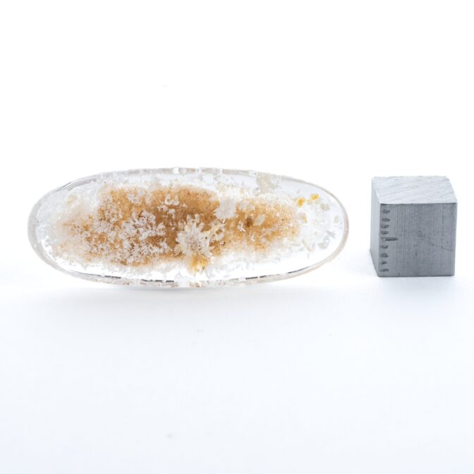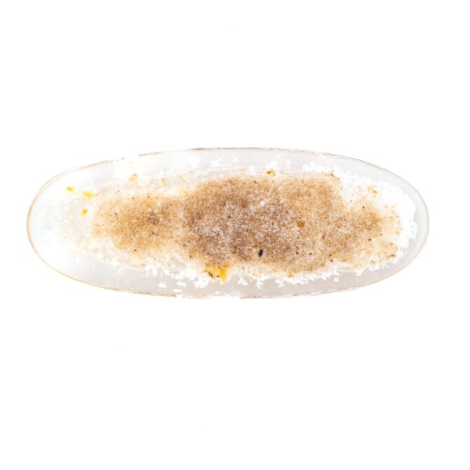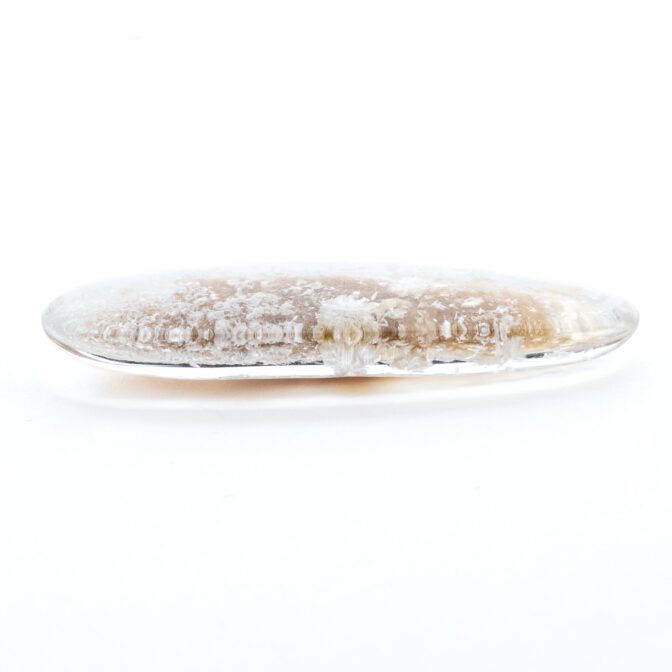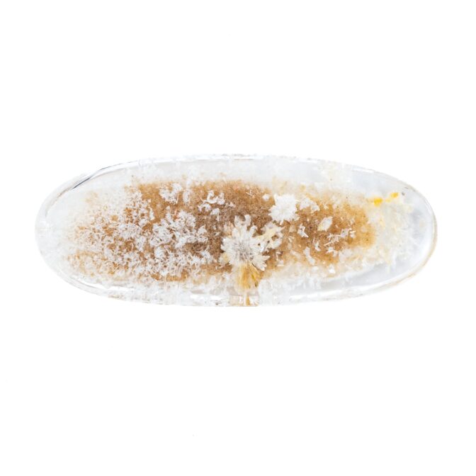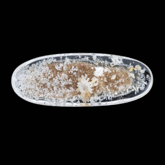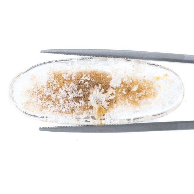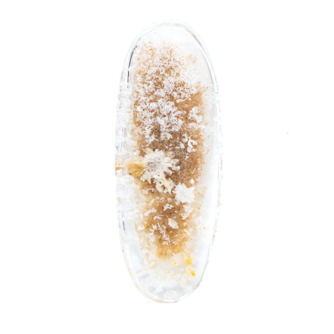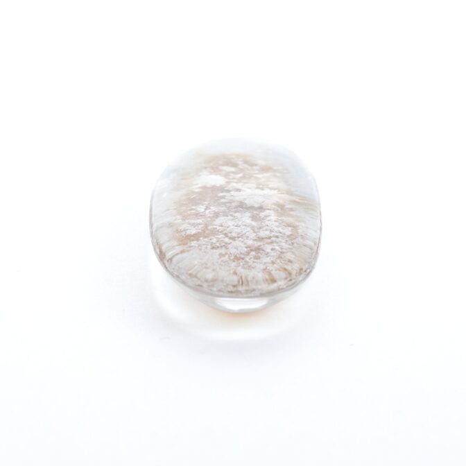 このページでご紹介するのは、ふわふわハリハリの結晶を持つホワイトガーデンクォーツ。細長いオーバルという洒落た形にカットされ、白く輝く星のような結晶が全体に散りばめられています。まるで、小さな頃ビーチで夢中になって探した星の砂のよう!あの頃の懐かしい思い出をギュッと閉じ込めたようなルースは、心穏やかな気持ちにさせてくれます。