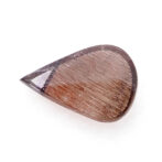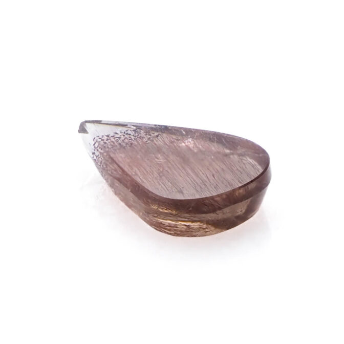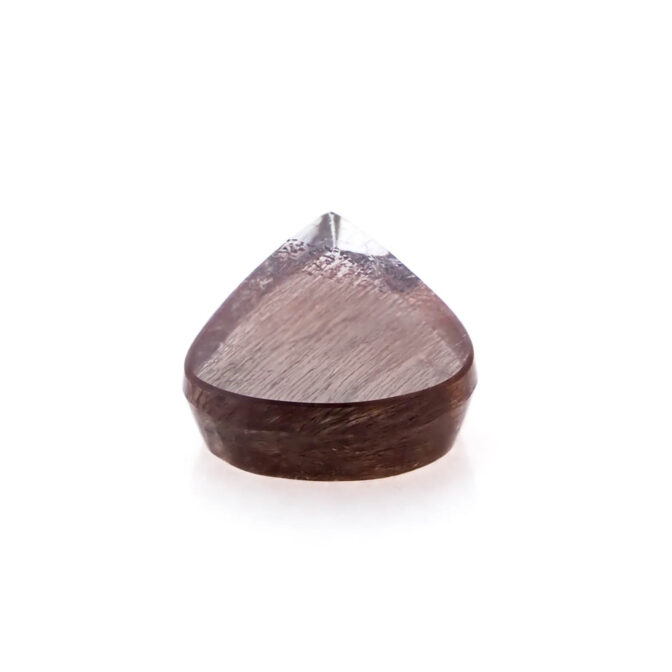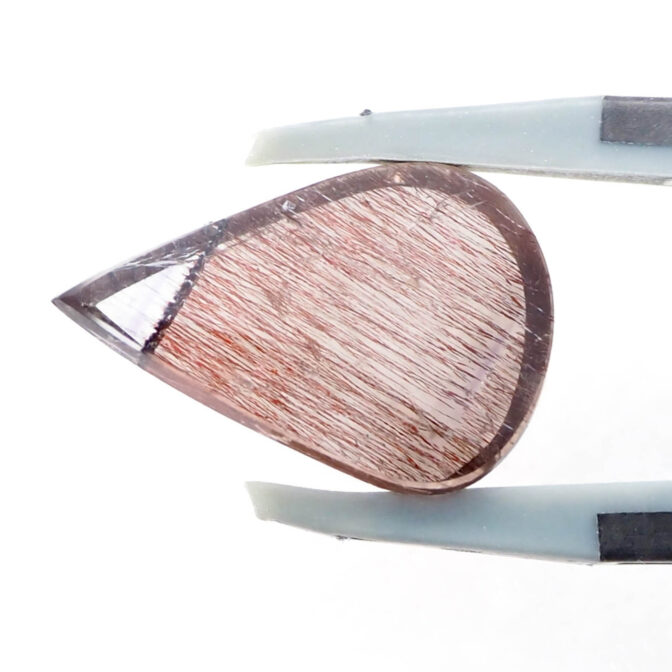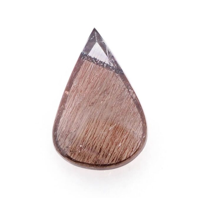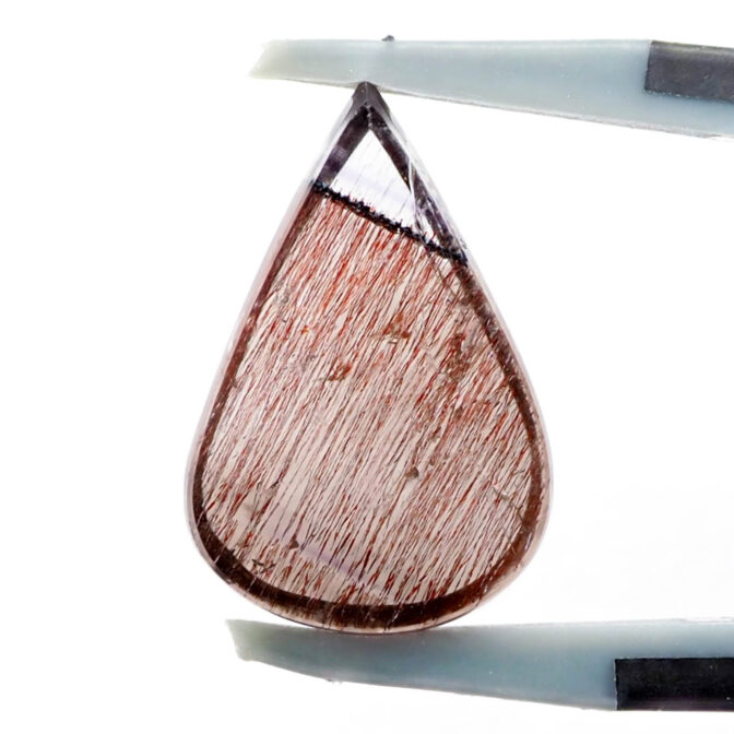 透明なクォーツの中に赤色のゲーサイトが散りばめられ、華やかな美しさ。ところどころでシュワシュワとサイダーのような不思議な輝きが明滅するのも、インクォーツ好きにはたまりません。まるで定規で線を引いたかのように、スパッと斜めに横切るインクルージョン部分と、上部のちょうどティアドロップの先端にほんの少しだけ残っている透明な部分が絶妙なバランスです。とても構築的な印象があり、自然の造形美にため息がでてしまいます。