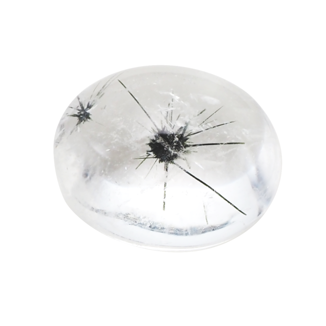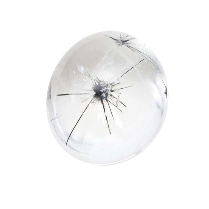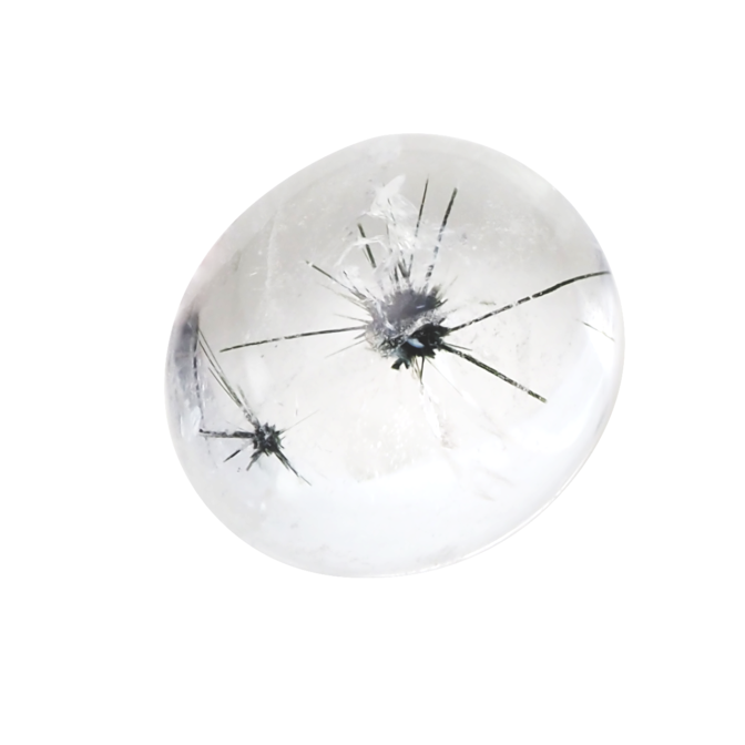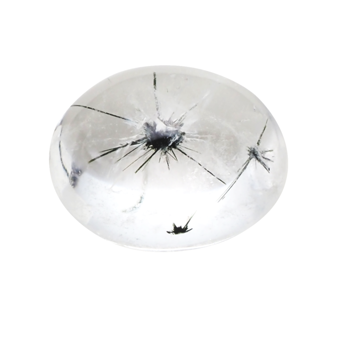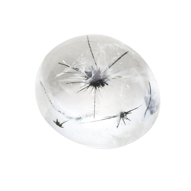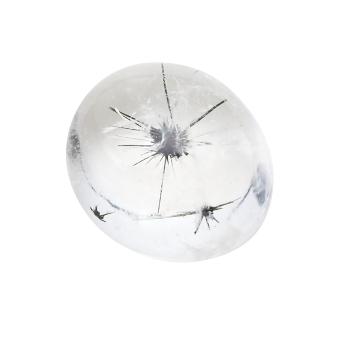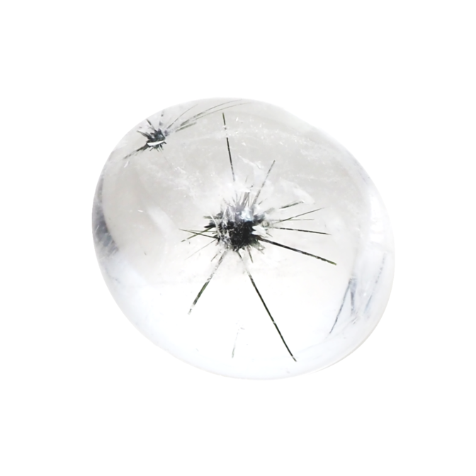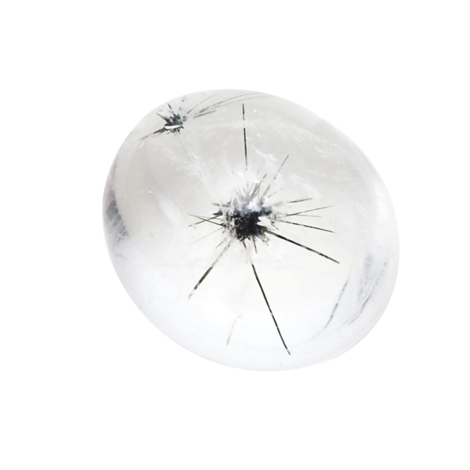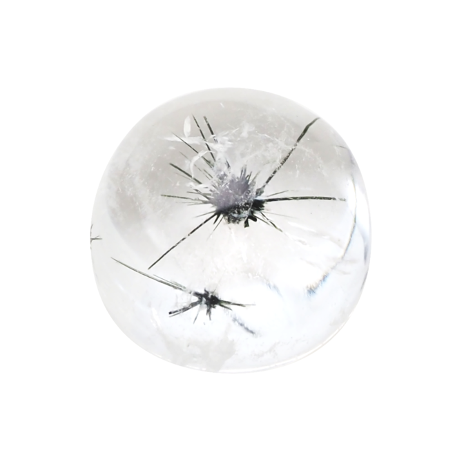 ウニ入り水晶!?いえいえ、その黒くてトゲトゲインクルージョンの正体はホーランダイト。通常は塊状で産出しますが、クォーツの中で針状の結晶として成長する不思議な鉱物です。水をたたえたようなつるんと丸いクォーツの中に堂々と収まるその姿は微笑ましくも個性的な迫力です。