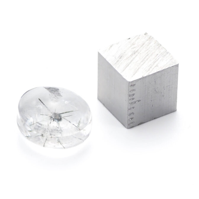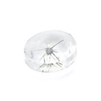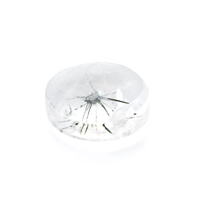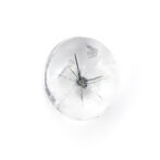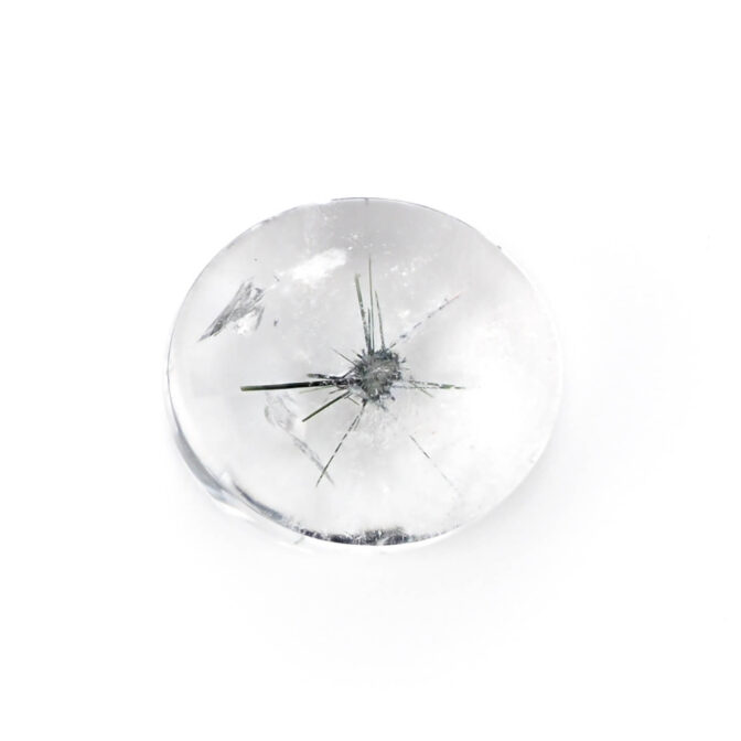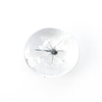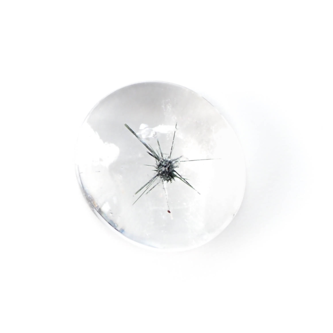 ウニ入り水晶?黒くてトゲトゲした摩訶不思議なインクルージョンの正体は、ホーランダイトという鉱物です。単体だと塊状で産出し特徴のある形ではないのですが、クォーツの中に入るとツンツン尖って成長する面白い性質を持つ鉱物です。水をたたえたようなつるんと丸いクォーツの中に収まるその姿は、微笑ましくも個性的な迫力があります。