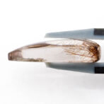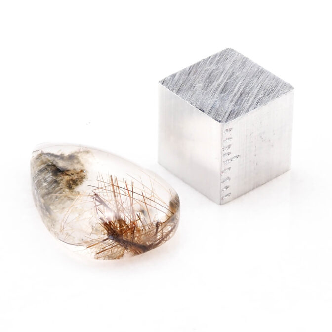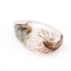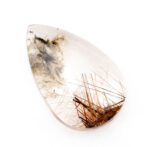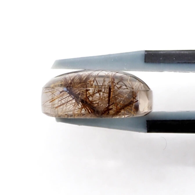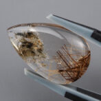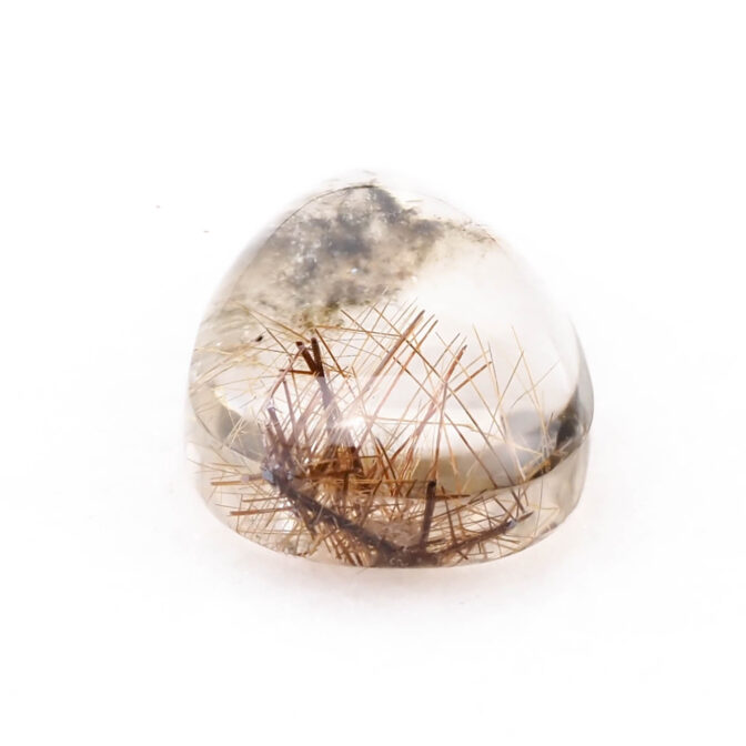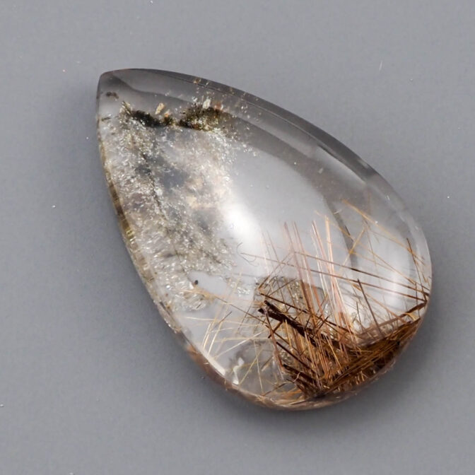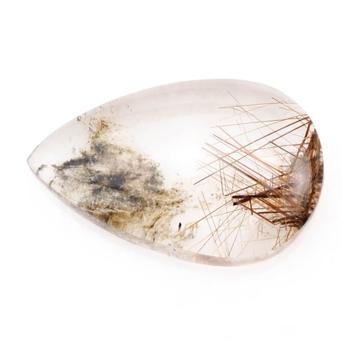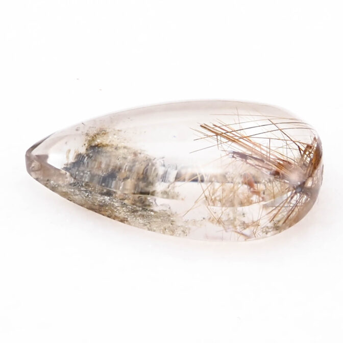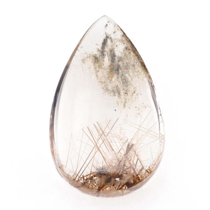 このページでご紹介しているマイカインルチルクォーツは、カットも磨きも完璧なティアドロップシェイプ。なだらかなカーブを描くカボションのドームは柔らかい曲線を描き、レンズのようにクリア。インクルージョンをさらに美しく見せてくれます。