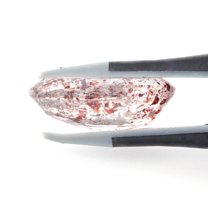 このページでご紹介しているレピドクロサイトインクォーツは、一見スタンダードなオーバルファセットカット。でも、よく見るとこの石の良さを活かすための工夫が随所に見られます。ルースの中央付近を天の川のように横切るレピドクロサイトを活かすため、テーブル面(おもて面の平らな部分)を広く取っています。ファセットの屈折で、内包物が見えなくなることを防いでいるのです。パビリオン側(うら面)はキューレット(細く尖っている部分)が石の真ん中ではなく、大きくずれています。これはクォーツの反射を抑え、表からインクルージョンが見えやすくするためです。クォーツの屈折率を理解した上で、この石の透明度と内包物の魅力を、最大限に引き出す見事なカットが施されているプレミアムなルースです。