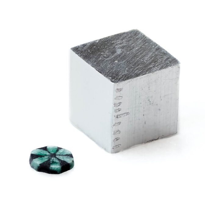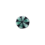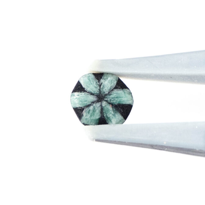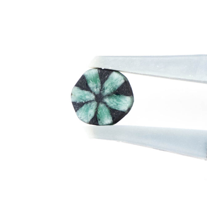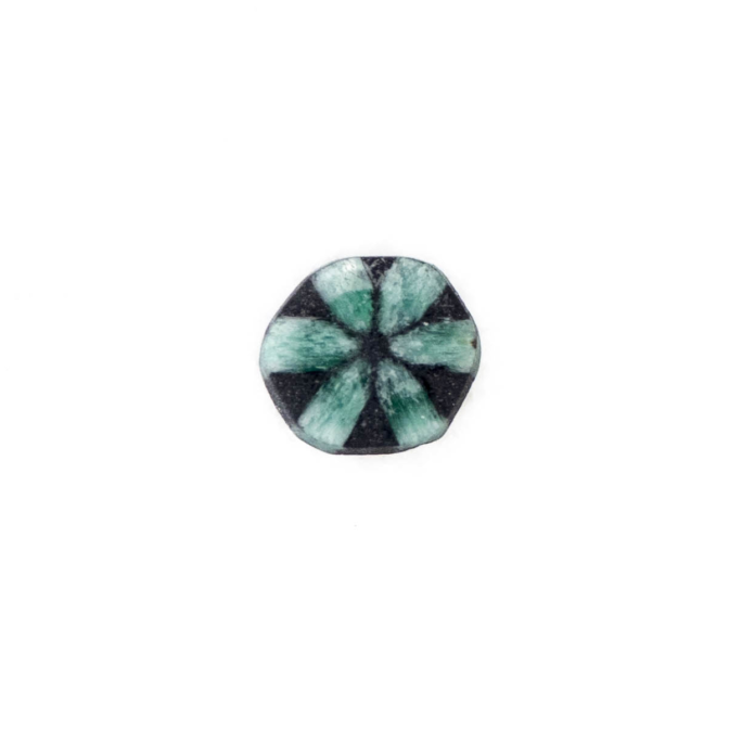 明るく華やかなエメラルドグリーンと黒い母岩のコントラストがとてもクールで、可愛らしさと落ち着きを兼ね備えた風情が感じられます。通常、トラピッチェエメラルドは形が歪んでいることが多いですが、こちらのルースは均整の取れた美しい形状をしています。