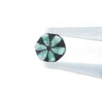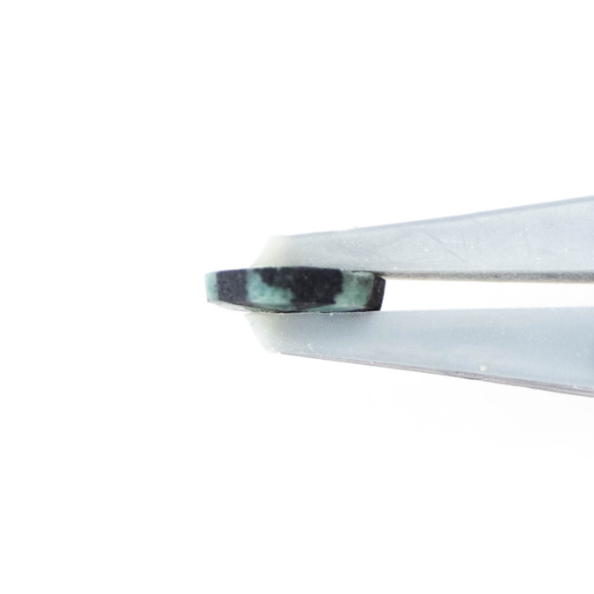 柔らかいトーンのエメラルドの中にバランス良く配置された黒い部分は、丁寧な研磨と相まって石の端正さを引き立てています。裏返しても、美しい表面と同様に楽しめるため、フクリン留めのネックレスにすると両面から石の個性を最大限に引き出すことができます。