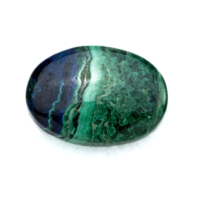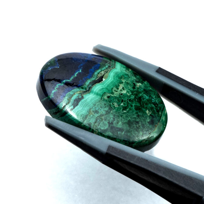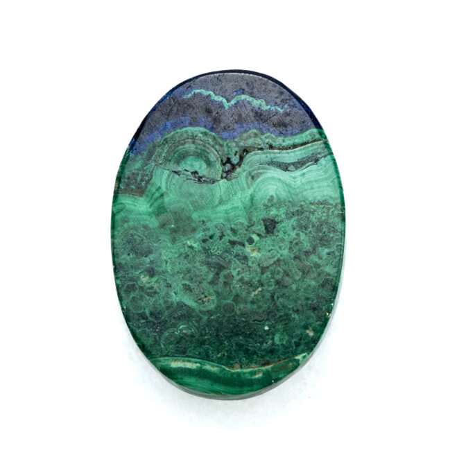 アズライトもマラカイトも、銅の鉱山付近で銅の二次鉱物として産出します。それぞれが単独で結晶化することもありますが、多くは混合した状態で発掘され、アジュラマラカイトと呼ばれます。濃い紺色の背景に、マラカイト独特のグリーングラデーションと幾何学模様が映え、時には単独の結晶よりも美しい景色をもつ石となります。大地の気まぐれと研磨職人のセンスの合わせ技で生み出される、世界で一つだけの一点もののルースです。