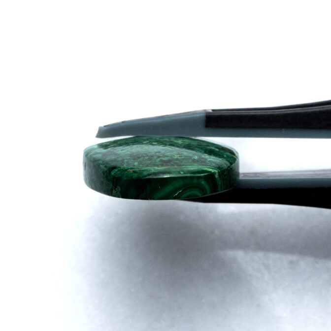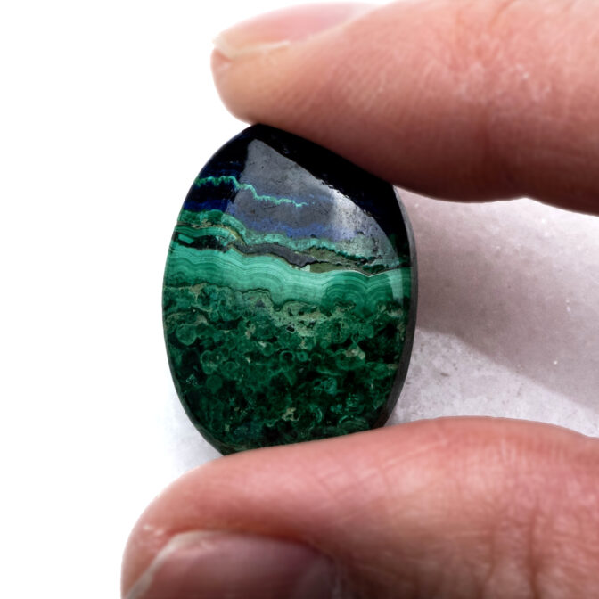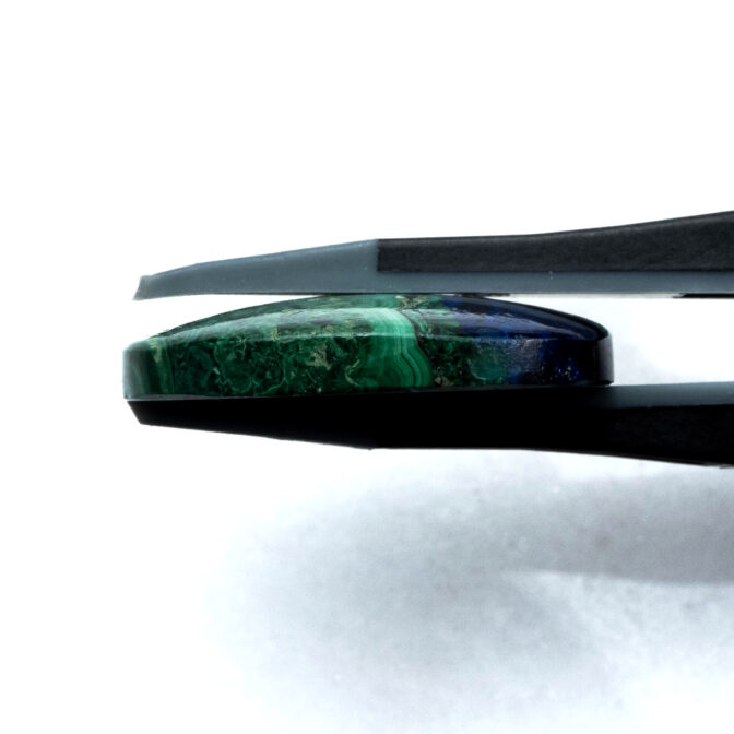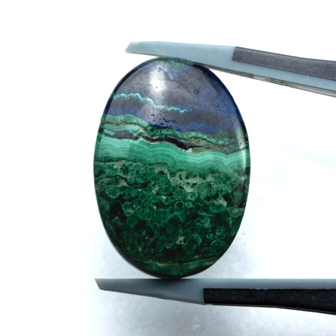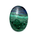 このページでご紹介しているアズラマラカイトは、形よく美しいオーバルカボションに磨かれており、本当に自然の一部を切り取って模様にしてしまったかのよう。いくつか集めて額縁に入れて鑑賞しても楽しめそうな、芸術性の高い石です。