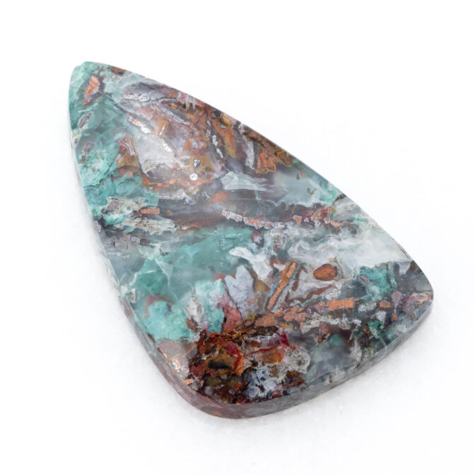 クリソコラとは銅鉱床から産出し、多くの場合、マラカイトやアズライトなど他の鉱物と一緒にに採掘されます。よって、銅や他の鉱物がが共生した状態で発見されるのは珍しくありません。しかし、澄んだ質の高いカルセドニーの中に、銅とクリソコラが程よいバランスで抱かれている例は極めて少ないのです。鈍く輝くコッパーブラウンの自然銅の美しさを生かしながら、クリソコラとの見事な饗宴は芸術的ですらあります。クセのないカルセドニーの柔らかな輝きがこの個性の強い二つの鉱物を鉱物をうまくまとめているのです。