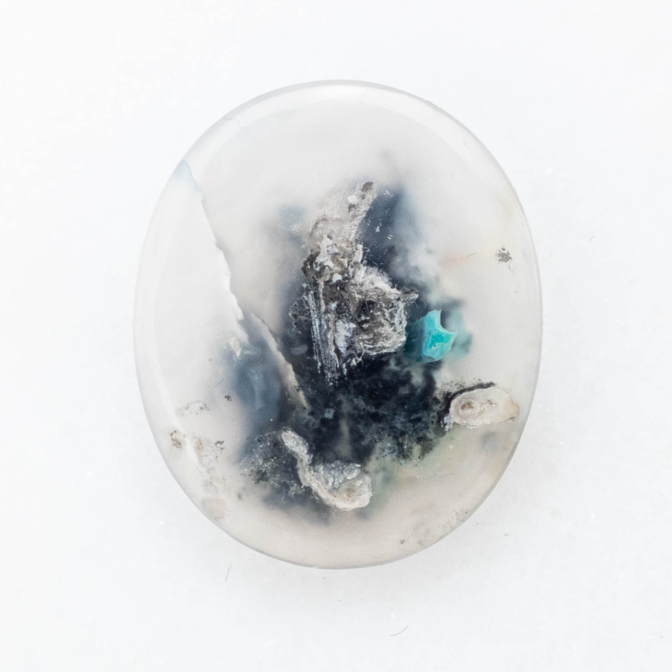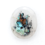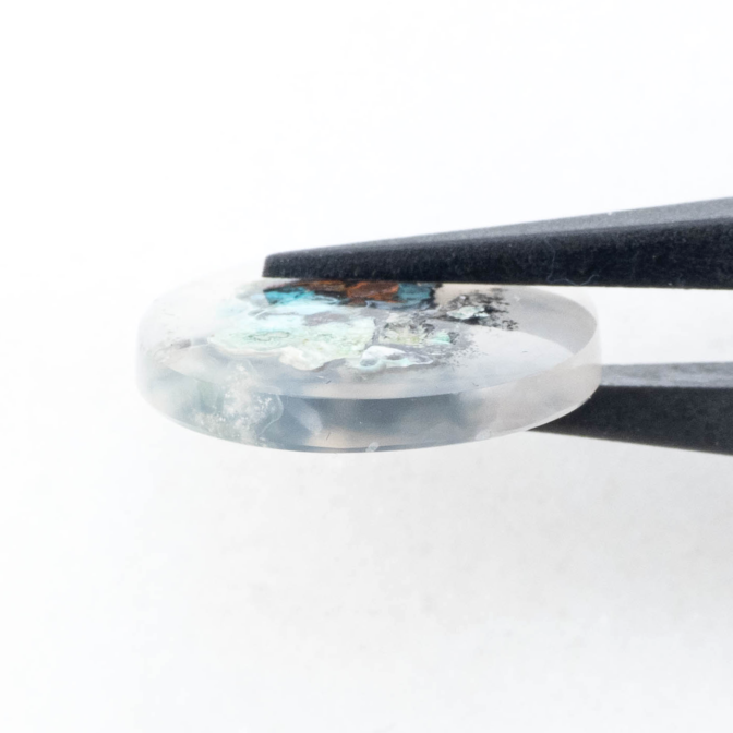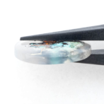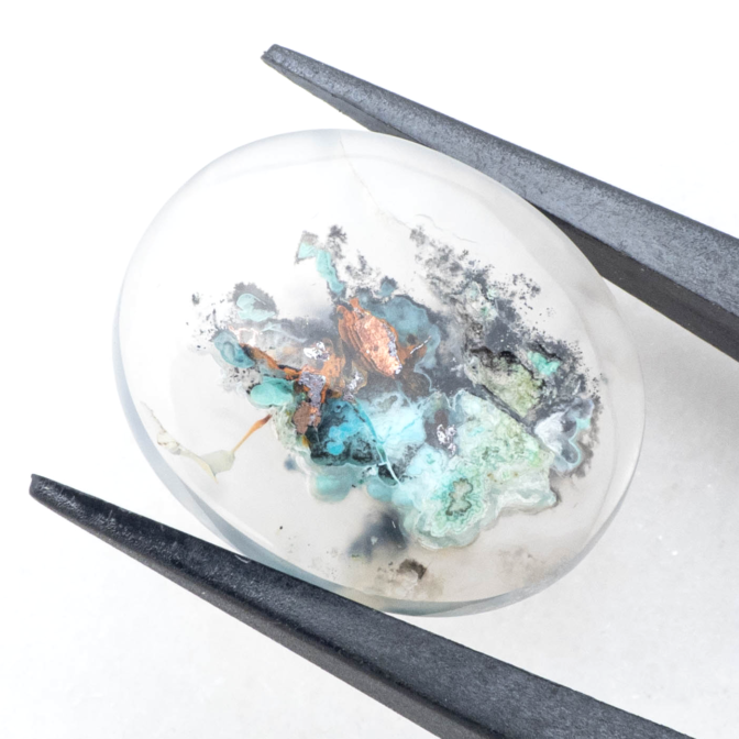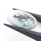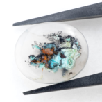 このページでご紹介しているルースは、独特の美しさを持つコッパークリソコラカルセドニーを、まろやかな輝きのオーバルカボションに磨き上げています。クリソコラのみずみずしいブルーが斬新な美しさを持ち、光が当たるとブロンズ色の金属光沢が一段とまばゆくきらめきます。模様の素晴らしさと色の美しさ、そして自然の不思議さを堪能できる、コレクションピースとしてもおすすめ。ジュエリーに仕立てたい場合は、クラックが多いので、石留めにご留意くださいね。