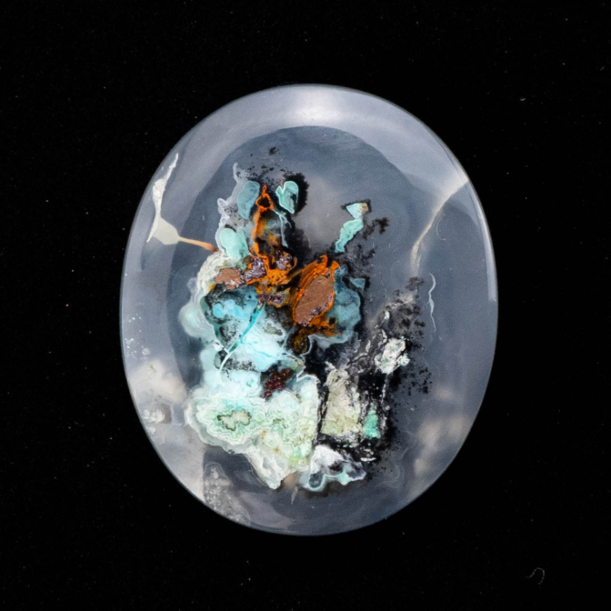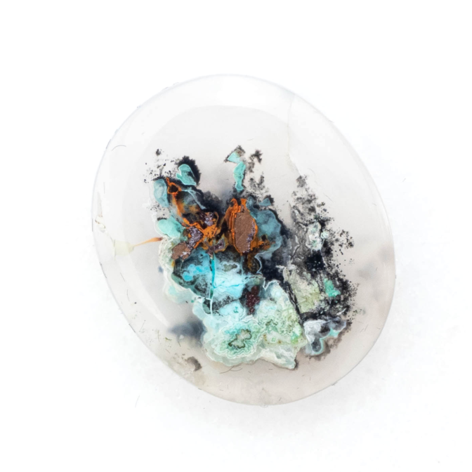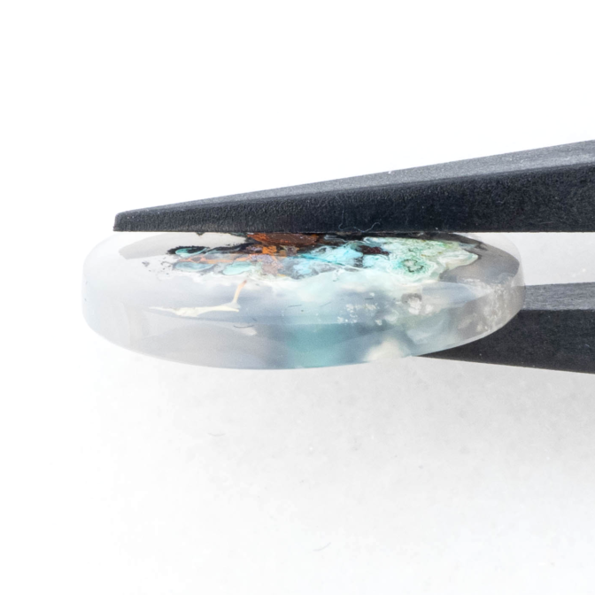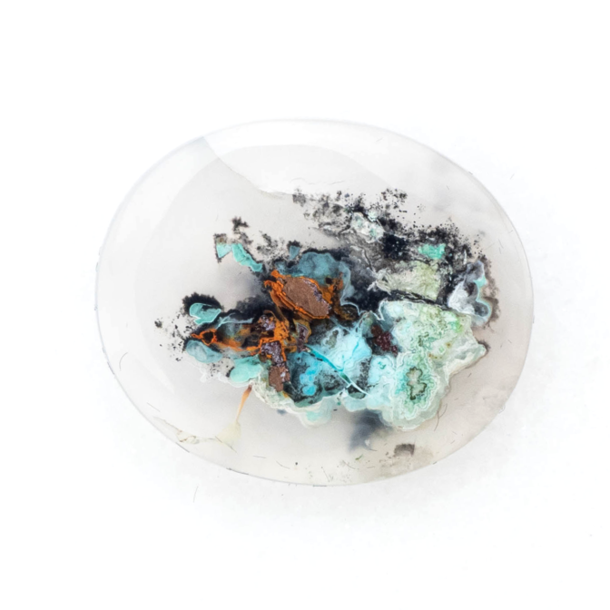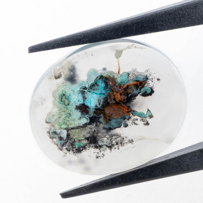 半透明の穏やかな輝きをもつカルセドニーの中に、鮮やかな色と複雑な模様が目をひく魅惑的なルース、コッパークリソコラインカルセドニー。一際美しい発色のクリソコラのブルーと、渋いブロンズ色にきらめく自然銅の組み合わせが先鋭的なアートのよう。まるで、大輪の花が咲き誇るようなファンタジックなインクルージョンが、澄んだカルセドニーの真ん中にバランス良く配置されている様は圧巻の見事さ。個性あふれる一点ものルースならでは。世界で一つだけしか存在しない希少なルースです。