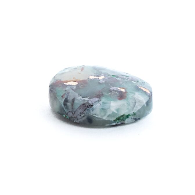 2025年3月現在、在庫にあるコッパークリソコラインカルセドニーは、全て同じロットです。形もほとんど全てがティアドロップシェイプで、それはそれで可愛いんだけで、少し変化が欲しくなってしまいました。しているこのページでご紹介しているルースも、もともとは一回り大きい雫シェイプだったのですが、思い切って自身でオーバルシェイプにリカットしてみました。磨きには並々ならぬ情熱を注いでいるので、さらにさらにうるうるつやつやになるまで頑張りました。結果、光が当たるとブロンズ色の金属光沢が一段とまばゆくきらめく麗しいルースに!模様の素晴らしさと色の美しさ、そして自然の不思議さを堪能できる、美しくも不思議な魅力をまとう石に生まれ変わりました。