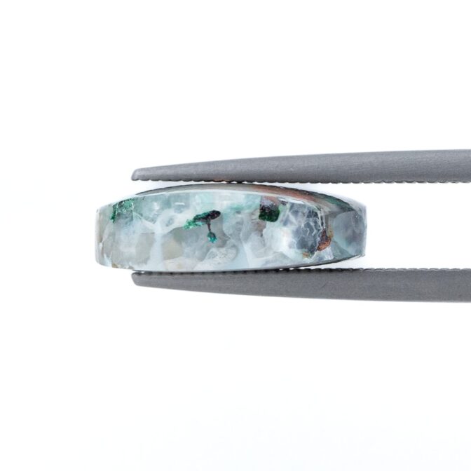 自然銅やクリソコラ、その他多くの鉱物やインクルージョンが、カルセドニーの中で様々な表情を織りなすコッパークリソコラインカルセドニー。ひとつひとつのルースがまるで全く違う石のような個性を持つのが魅力です。一際美しい発色のクリソコラのブルーと、渋いブロンズ色にきらめく自然銅の組み合わせが先鋭的なアートのよう。クリソコラの間からのぞく透明なカルセドニーと銅のブラウンがランダムに入り混じり、色と質感、輝きのゆらめきが美しいこと。よく見るとさまざまな色のインクルージョンも見え、シックでいながらカラフルな雰囲気。半透明のカルセドニーの中に折り重なるように見える模様は、奥行き感があり想像力を掻き立ててくれます。個性あふれる一点ものルースならではの景色は圧巻の美しさはこの石ならでは。世界で一つだけしか存在しない不思議な模様をもつ希少なルースです。