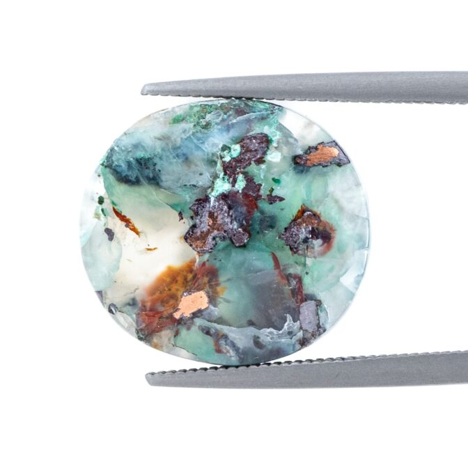 【色鮮やかに艶めくブロンズとカルセドニーの透明、クリソコラのブルーが芸術的なルース】