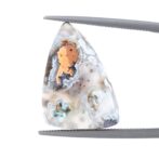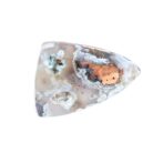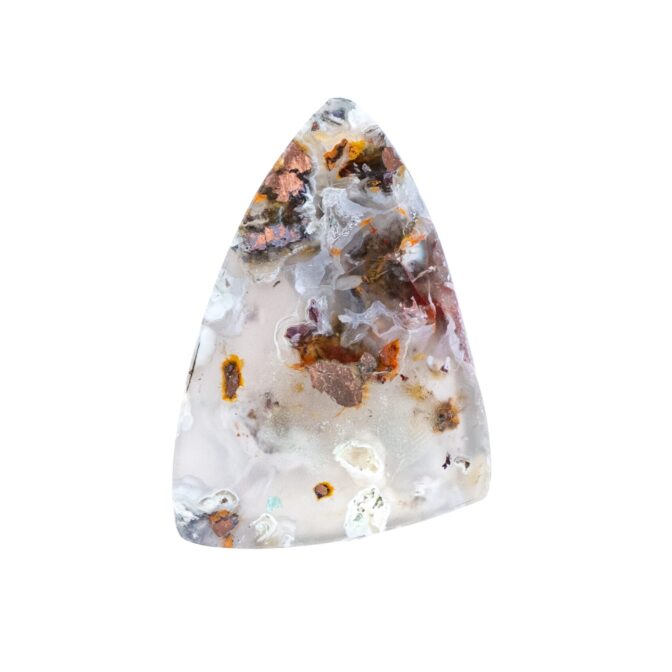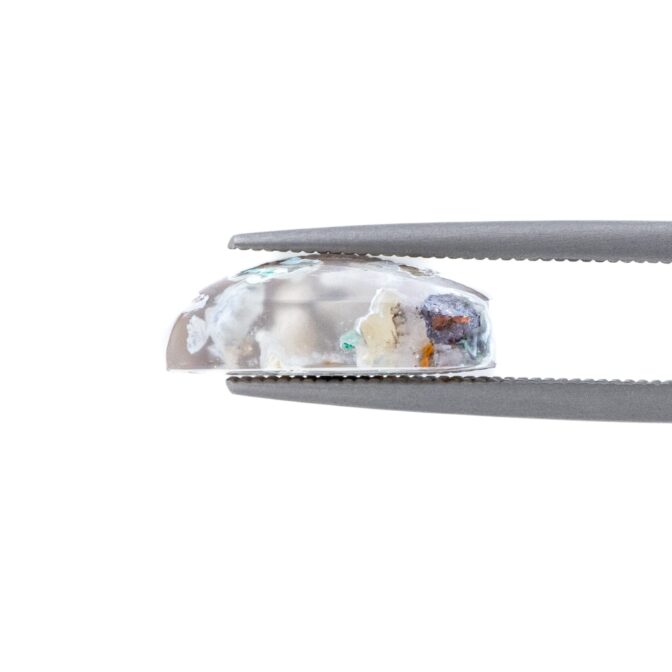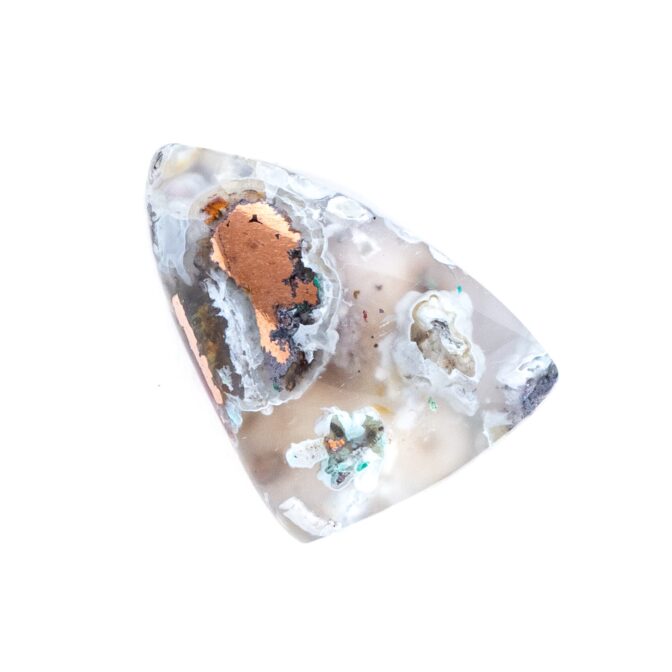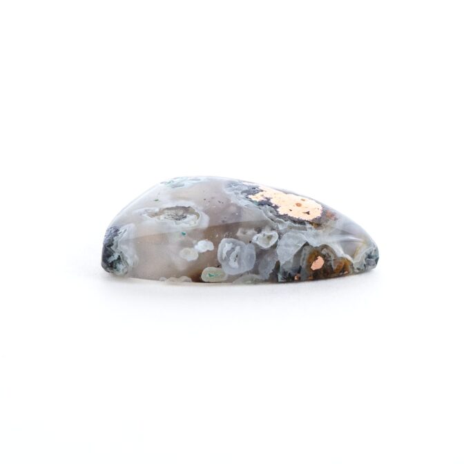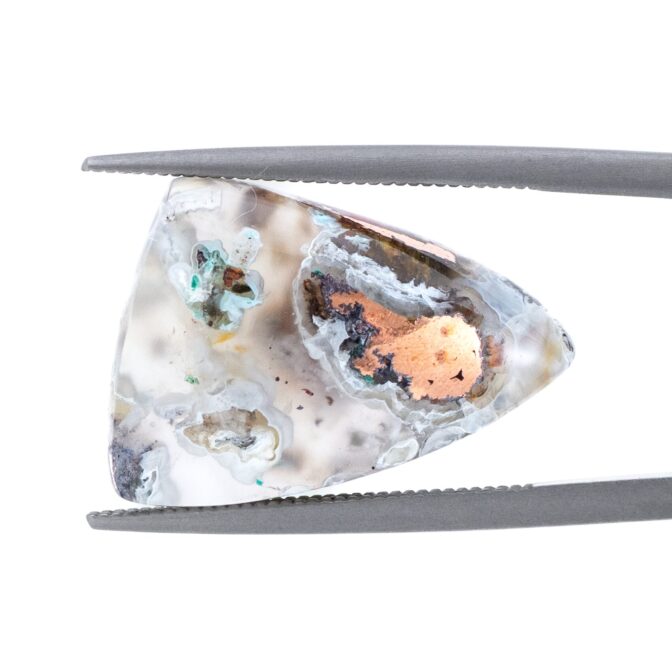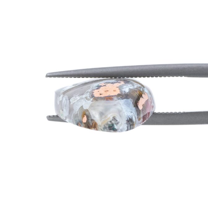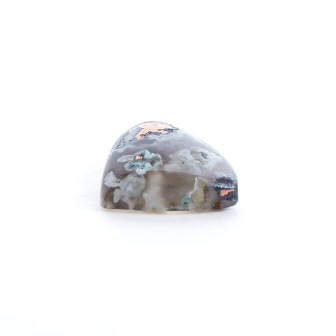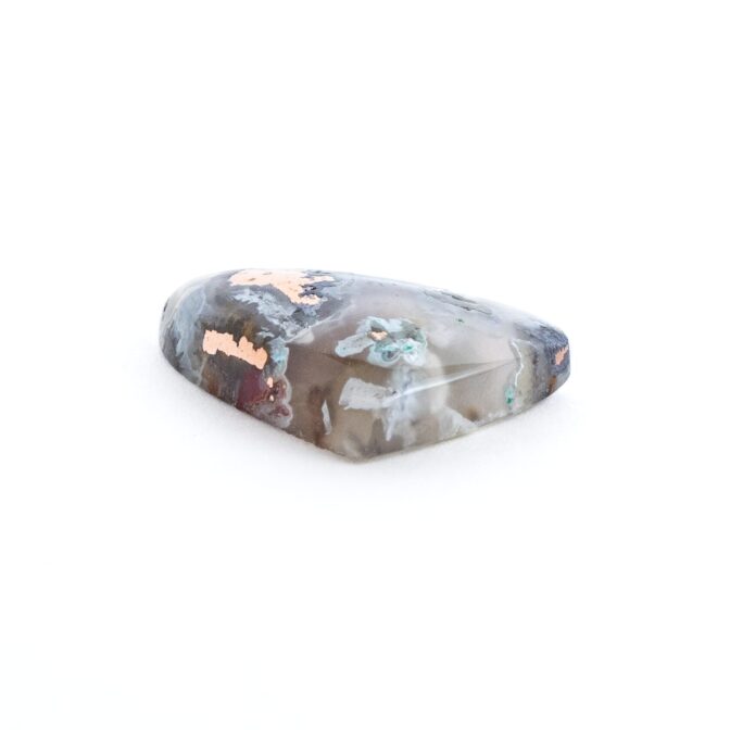 自然銅やクリソコラ、その他多くの鉱物やインクルージョンが、カルセドニーの中で様々な表情を織りなすコッパークリソコラインカルセドニー。ひとつひとつのルースがまるで全く違う石のような個性を持つのが魅力です。珊瑚礁の明るく暖かな遠浅の海を思わせるカルセドニーの透明さに、白いインクルージョンと、クリソコラのブルーグリーンがところどころアクセントになっています。よく見るとさまざまな色のインクルージョンも見え、シックでいながらカラフルな雰囲気。半透明のカルセドニーの中に折り重なるように見える模様は、奥行き感があり想像力を掻き立ててくれます。個性あふれる一点ものルースならではの景色は圧巻の美しさはこの石ならでは。世界で一つだけしか存在しない不思議な模様をもつ希少なルースです。