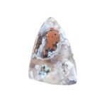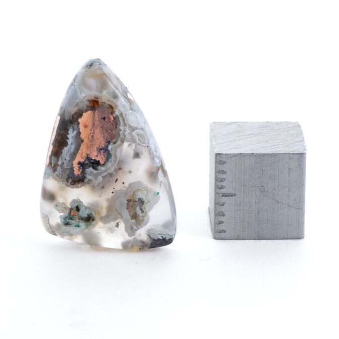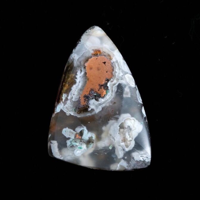 クリソコラとは銅鉱床から産出し、多くの場合、マラカイトやアズライトなど他の鉱物と一緒に採掘されます。よって、銅や他の鉱物が共生した状態で発見されるのは珍しくありません。しかし、澄んだ質の高いカルセドニーの中に、銅とクリソコラが程よいバランスで抱かれている例は極めて少ないのです。鈍く輝くコッパーブラウンの自然銅の美しさを生かしながら、クリソコラとの見事な饗宴は芸術的ですらあります。クセのないカルセドニーの柔らかな輝きがこの個性の強い二つの鉱物を鉱物をうまくまとめているのです。