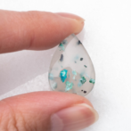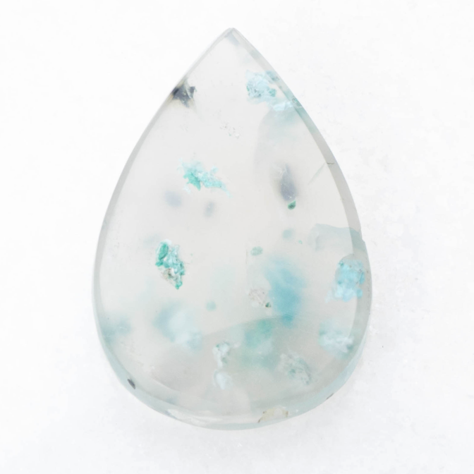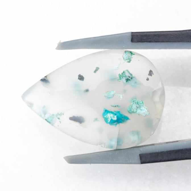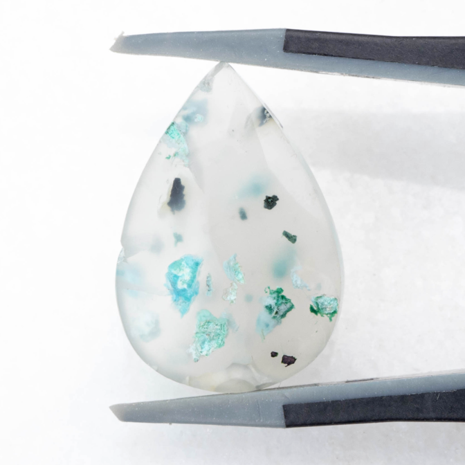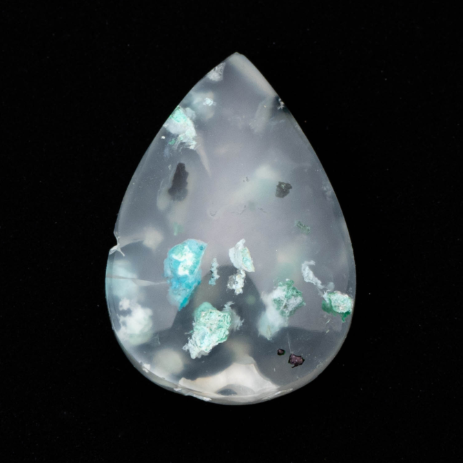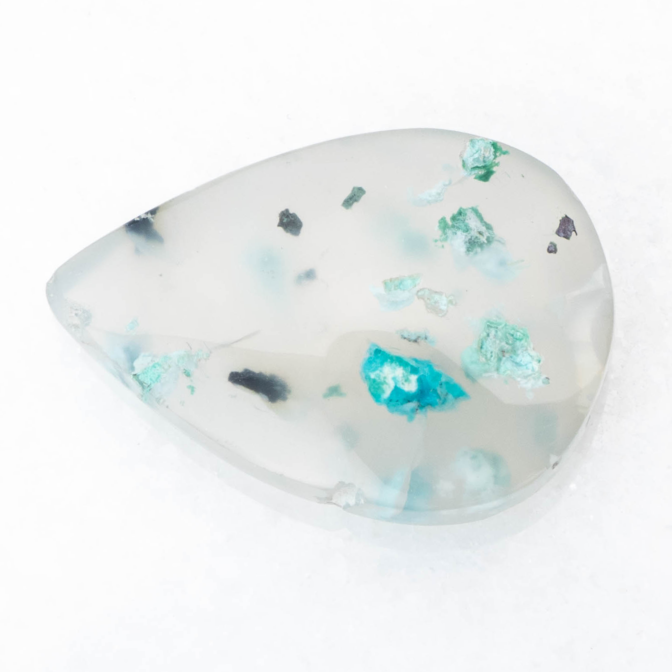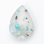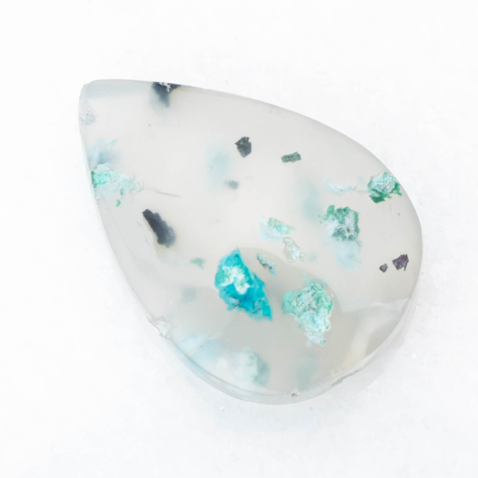 クリソコラとマラカイトの共通点は銅を含む鉱物であること。よって鮮やかなブルーとグリーンに発色します。ふっくらしたドロップシェイプに磨かれ、整った可愛らしいシルエットが自慢。カルセドニー独特の潤いを感じさせる半透明の石の中に、水玉模様のようにランダムに散らばるクリソコラマラカイトの彩りも鮮やか。大粒ながらも軽やかさを合わせもち、爽やかな美しさが魅力。インクルージョンが多いのに磨きも美しく、つるんとした表面は光を弾いて麗しい輝きです。