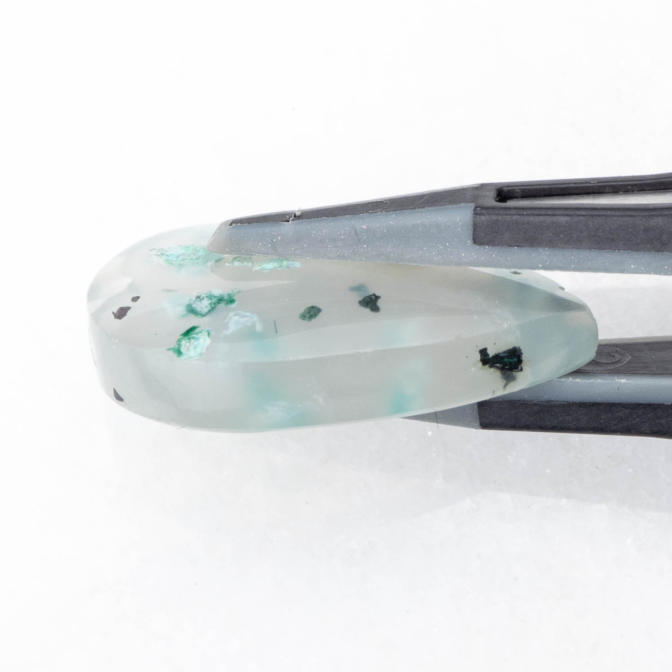 クリソコラマラカイトは本来脆い石でもありますが、カルセドニーに入り込んでいるため、強度は上がっています。ただ、インクルージョンが多い鉱物ため、表面や断面にインクルージョン由来の傷があります。この石ならではの味で天然の証ですので、あらかじめご承知おきくださいませ。