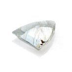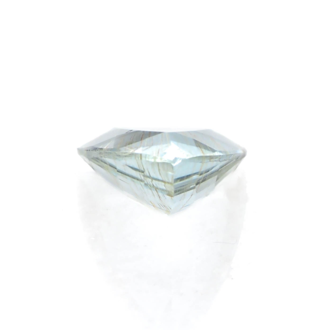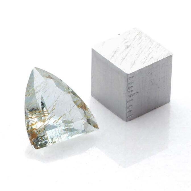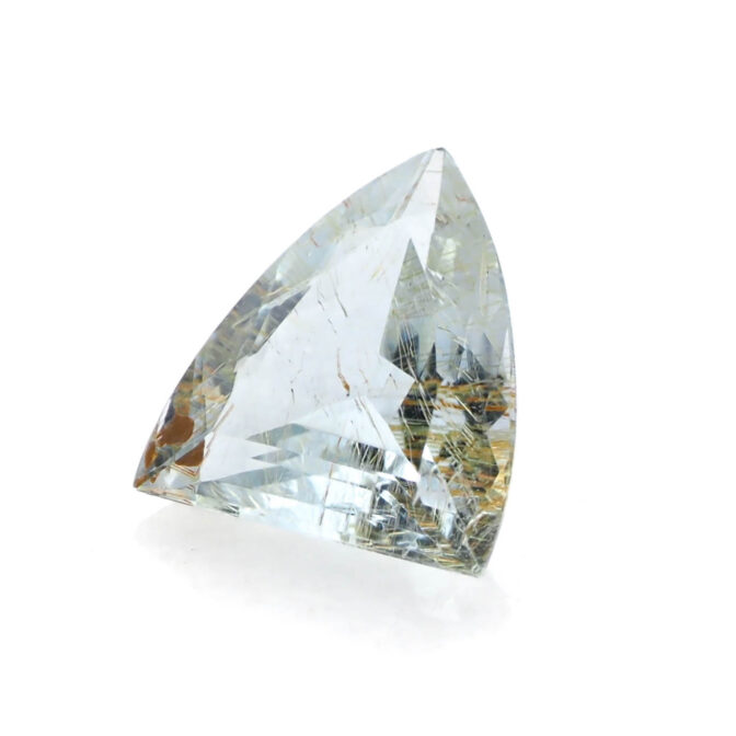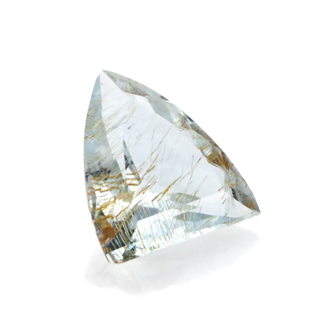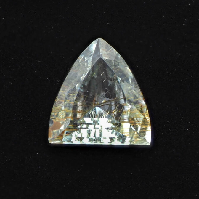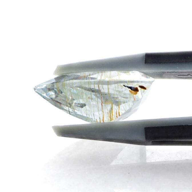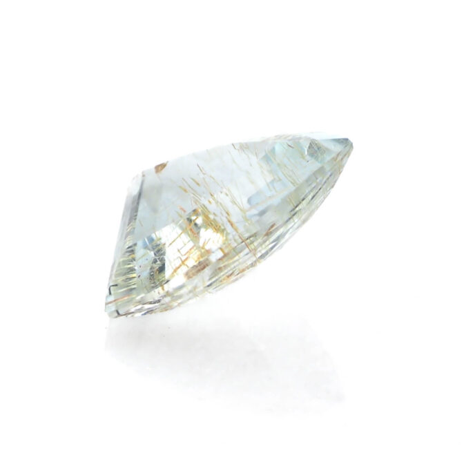 上質なアクアマリンの一大産地であるブラジル産だけあって、ベースとなるアクアマリンの美しさは極上。透明度の高い澄んだアクアブルーのきらめきは、私たちのハートをギュッと掴んで離しません。カットの入れ方も独特で、中央はインクルージョンのないアクアマリンの美しさを楽しめるようになっています。リモナイトの針は側面のファセット面に集中しており、光の当たり方と面の角度によって複雑に光を反射し、黄金の針に圧倒的な輝きをもたらすのです。