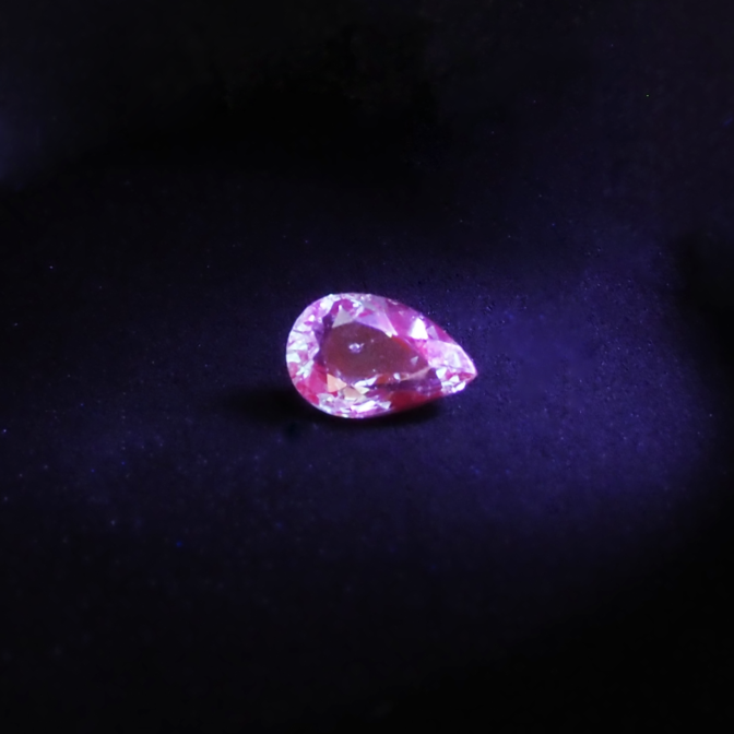 透明度抜群、キラキラとまばゆくきらめき、明るく鮮やかなグリーンの発色。これだけでも十分魅力的、十分美しいのになんと、UVライトで妖しく美しい赤紫に色を変えます。