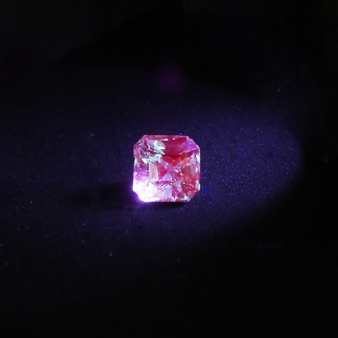 透明度抜群、キラキラとまばゆくきらめき、明るく鮮やかなグリーンの発色。これだけでも十分魅力的、十分美しいのになんと、UVライトで妖しく美しい赤紫に色を変えます。