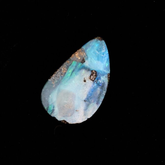 このページでご紹介しているボルダーオパールは、大変状態がよく、質も良いデッドストック。香港に買い付けに行った際、オーナーすら存在を忘れていたという逸話があります。引退するオパール専門店からまとめて引き取ったものの、数が多すぎてジュエリーにするにも手が届かず、持て余していたとのこと。なるほど、ジュエリー用だったからこその質の良さなのですね。上質なボルダーオパールは、カラット数を保つため、どうしても大粒になりがち。ですが今回のロットはやや小さめに形よくカットされ、ジュエリーにぴったりサイズなのが嬉しいところ。漆黒に艶めく母岩の間からチカチカと星のように瞬く遊色は鮮やかな紺色。鮮烈な輝きが黒い母岩から湧き出す様子はまるで夜空を走り抜ける雷鳴のよう。シックなのに華やかという相反する要素を持つ、2面性があるルースです。